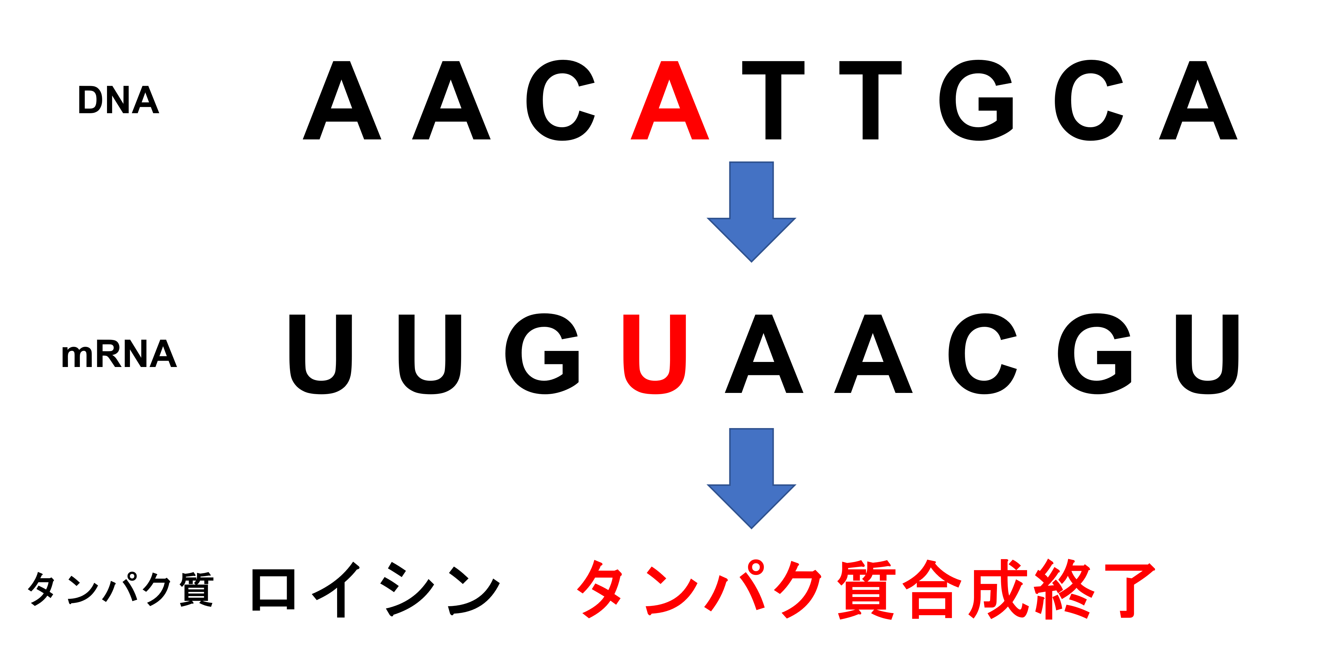 例えば先ほどのAAAがUAAに変わってしまい、リシンが作られずタンパク質合成が終わってしまいます。