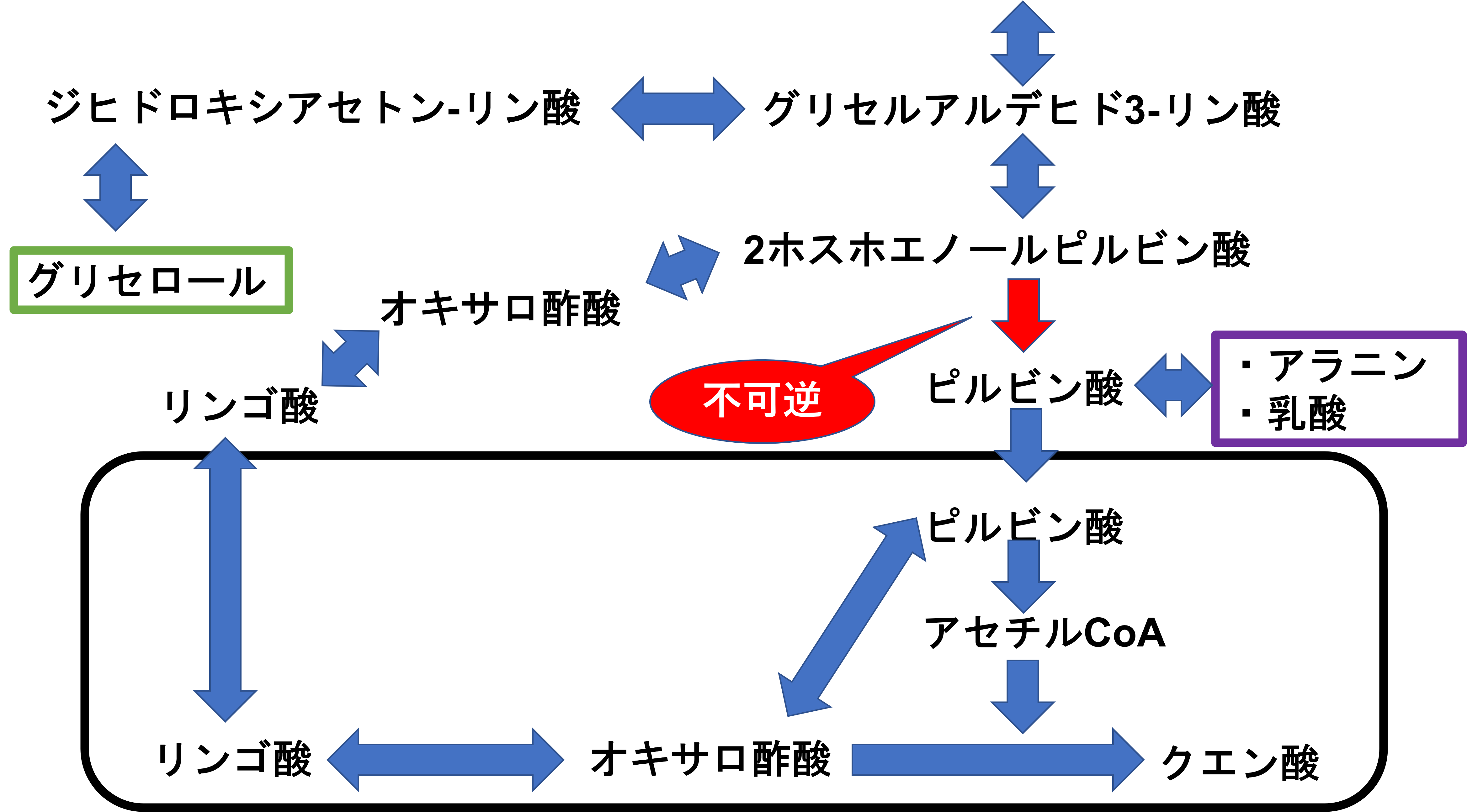 ところで、解糖系では2ホスホエノールピルビン酸からピルビン酸が作られましたが、糖新生ではぐるっと大回りすることで、ピルビン酸からホスホエノールピルビン酸となっています。これはなぜでしょうか?これは2ホスホエノールピルビン酸からピルビン酸が不可逆的反応のため、ピルビン酸から2ホスホエノールピルビン酸に戻ることができないからです。そのため大回りする必要があります。