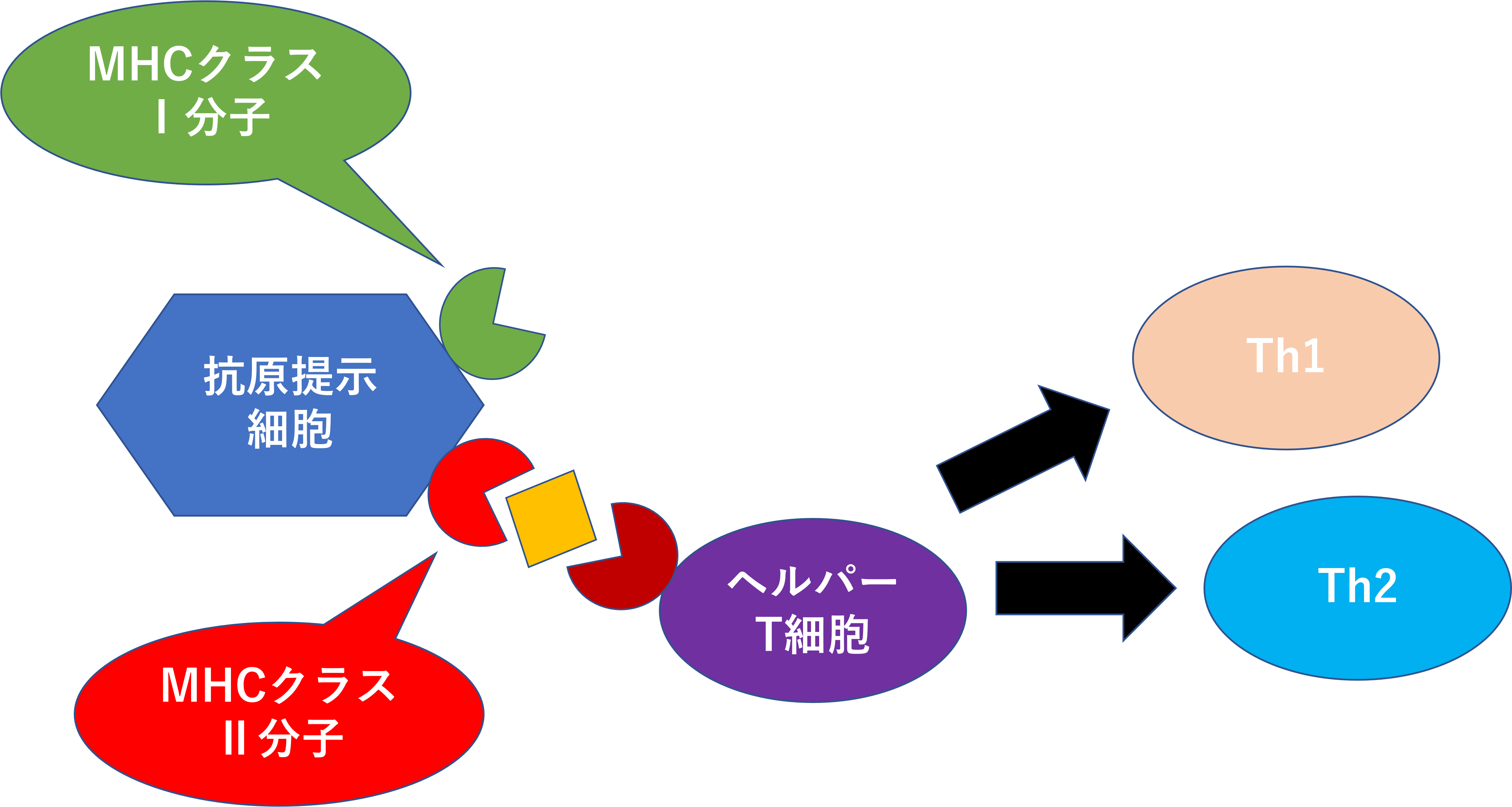 ヘルパーT細胞のレセプターは抗原提示されたものを認識した後は、マクロファージが産生するインターロイキン-1などによって機能の異なる2種類のヘルパーT細胞に分化します。