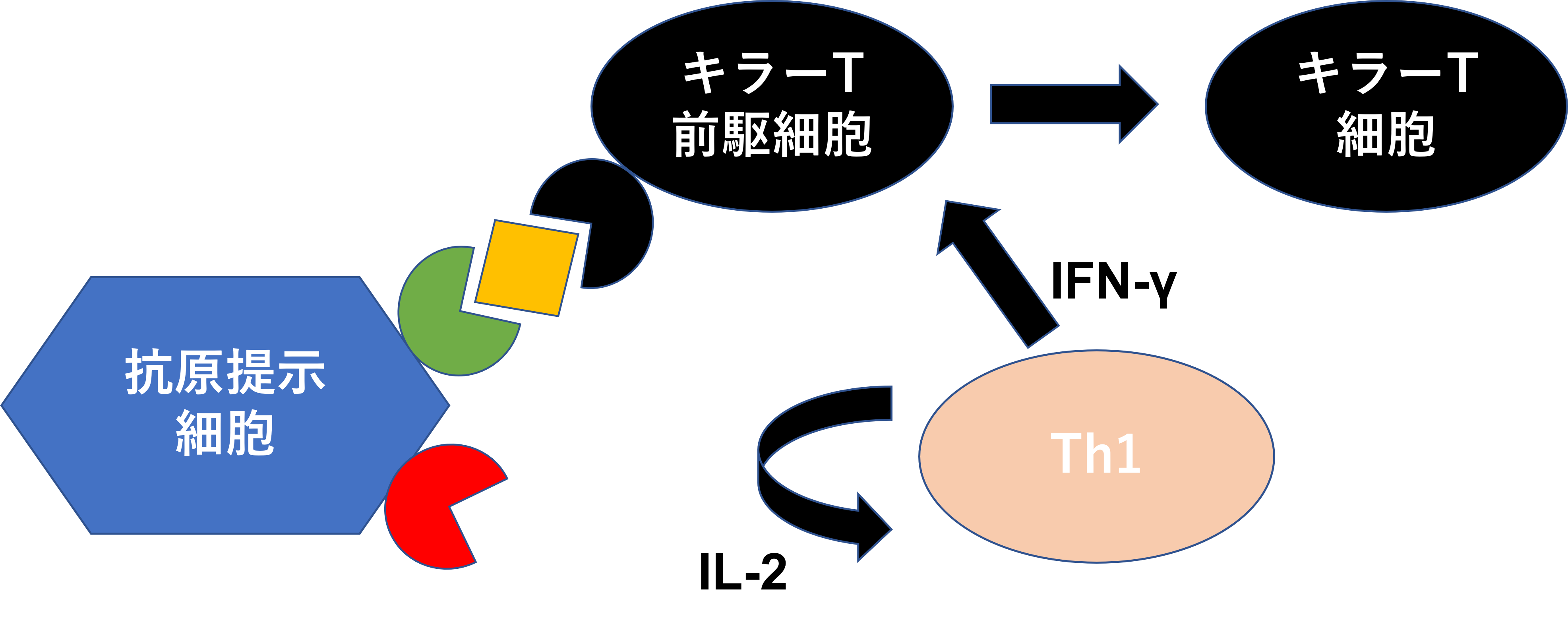 一方で活性化されたTh1はインターロイキン-2(IL-2)やインターフェロンγ(IFN-γ)を作ります。インターロイキン-2(IL-2)はT細胞を増殖させる作用、インターフェロンγ(IFN-γ)はキラーT細胞の誘導を促進させます。