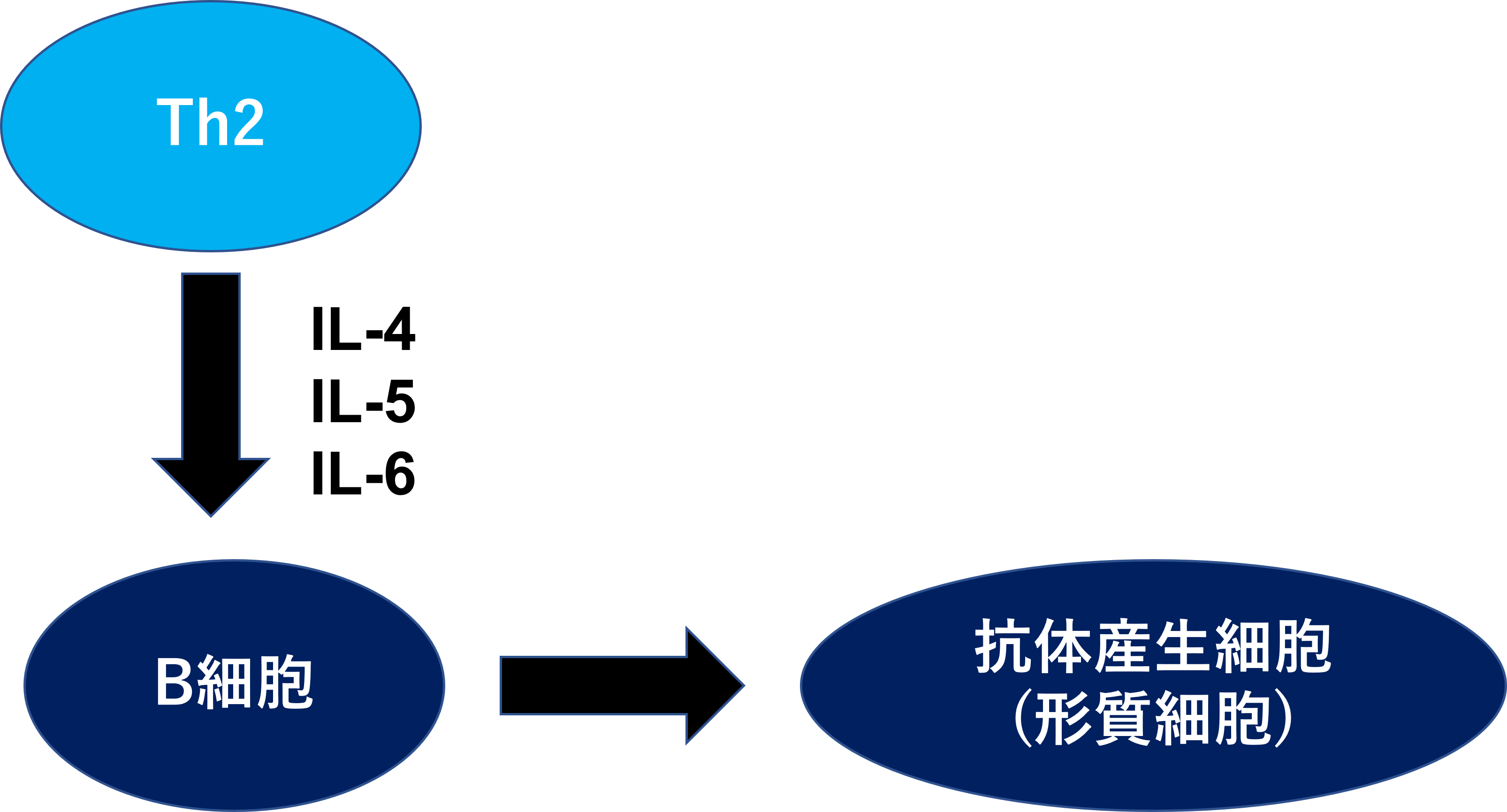 Th2はインターロイキン-4(IL-4)、インターロイキン-5(IL-5)、インターロイキン-6(IL-6)を作ります。これらのインターロイキンはB細胞の増殖や抗体産生細胞への分化を促進します。その結果、抗体が作られ体液性免疫が起こります。