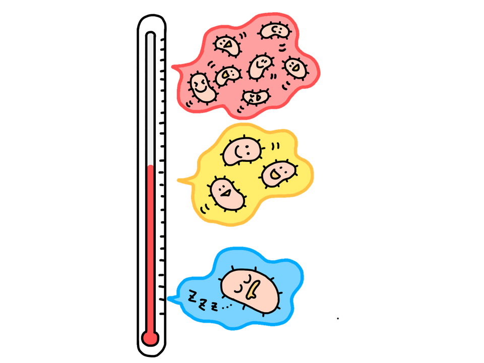 多くの細菌はヒトの体温に近い30〜37℃で良く増え、これを中温菌と呼びます。しかし水素イオン濃度と同じく、一部には20℃以下の温度を好む低温菌や、50℃以上の温度を好む高温菌などもいます。