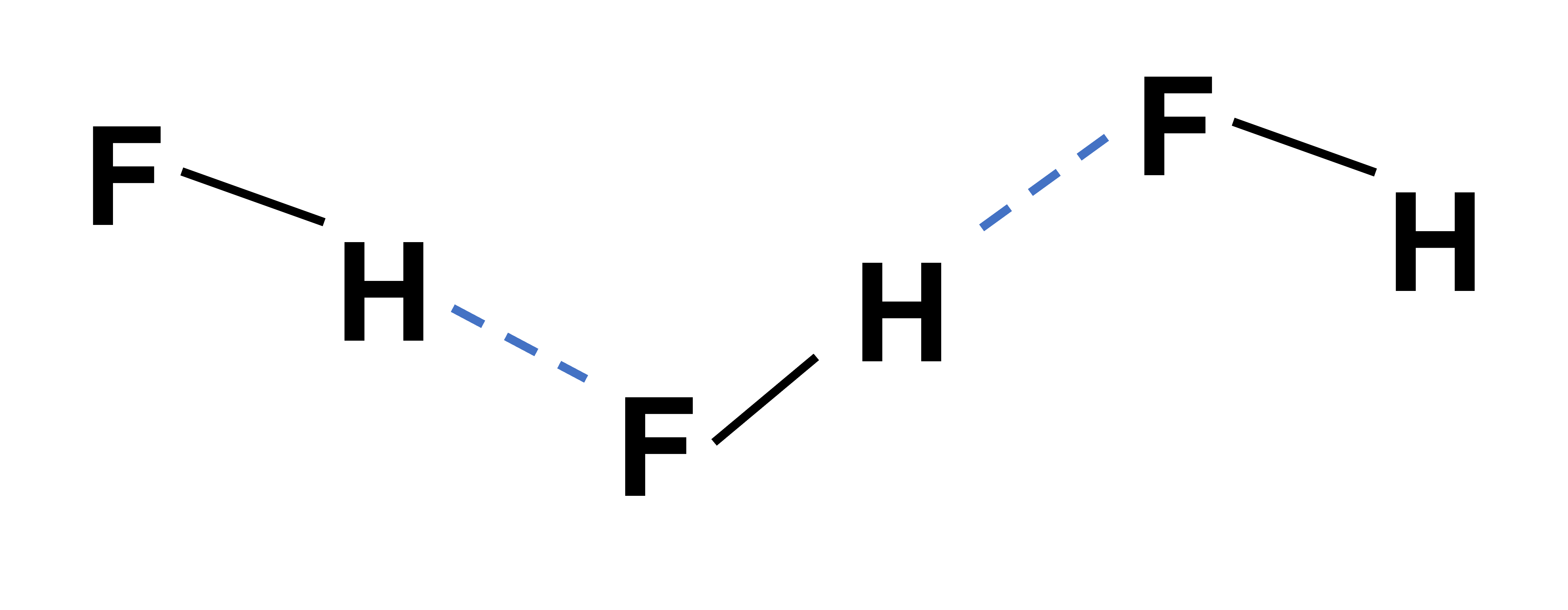 電気陰性度が大きいフッ素F、酸素O、窒素Nなどに直接ついて電子をとられた水素Hと、他の分子や分子内にあるF、O、Nなどの原子間に働く相互作用を水素結合と言います。例えばフッ化水素HFは以下のように水素結合が作られます。
