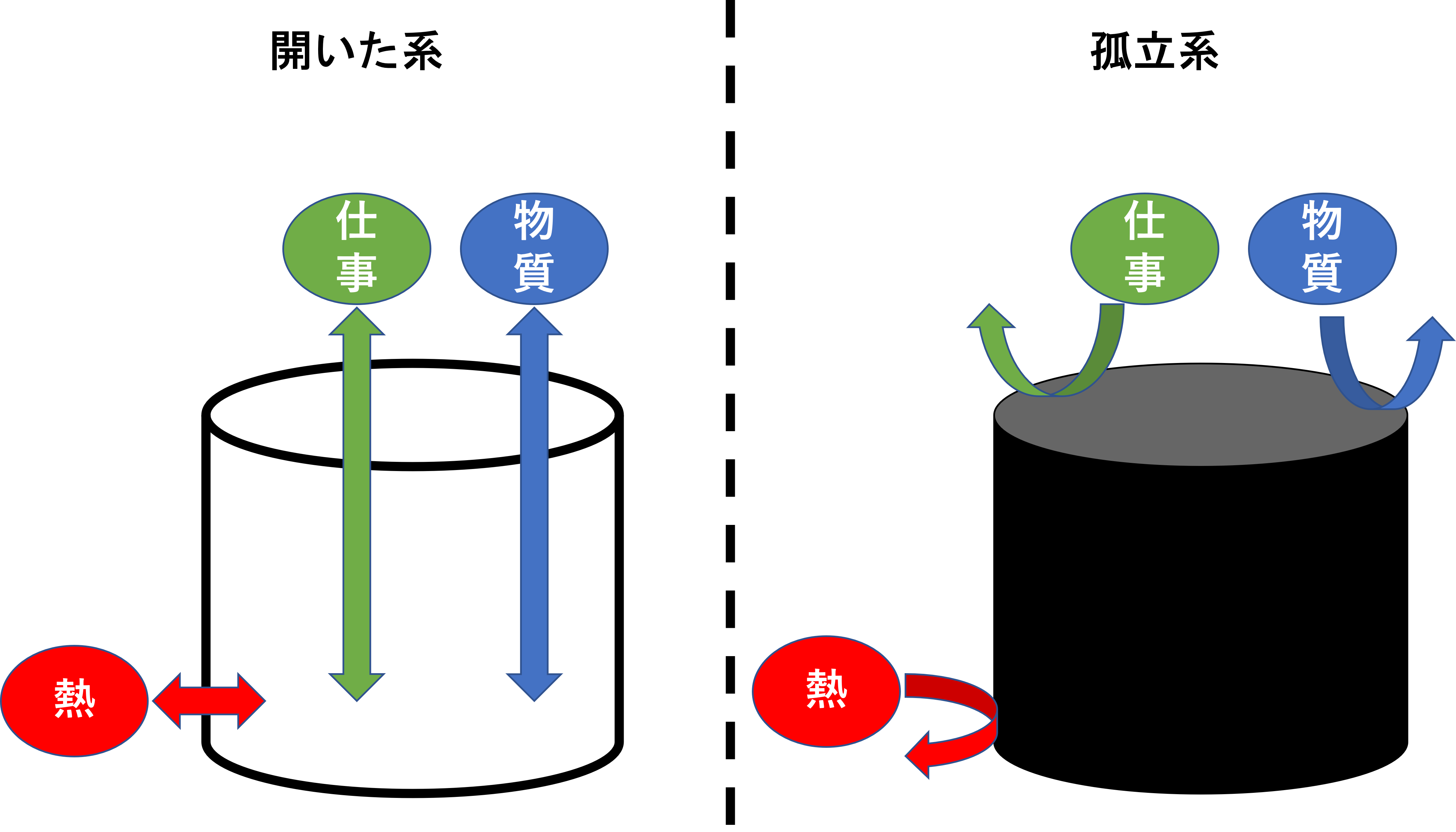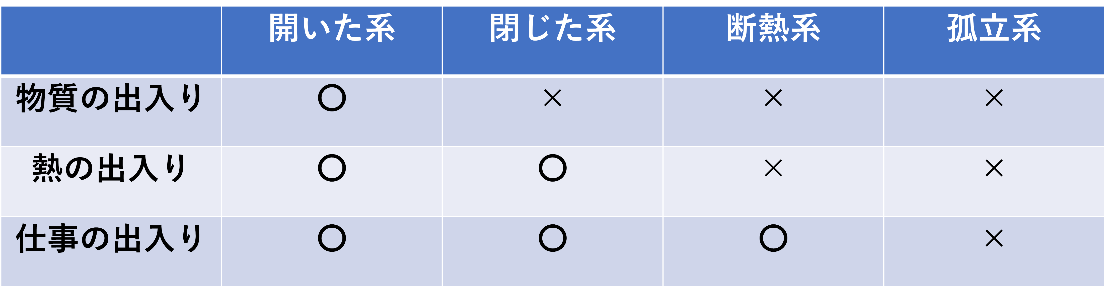 系とは熱力学などで使われる言葉であり、考察の対象となる部分を指します。物質、熱、仕事などをもとに考えたときには、代表的な系は以下の種類があります。