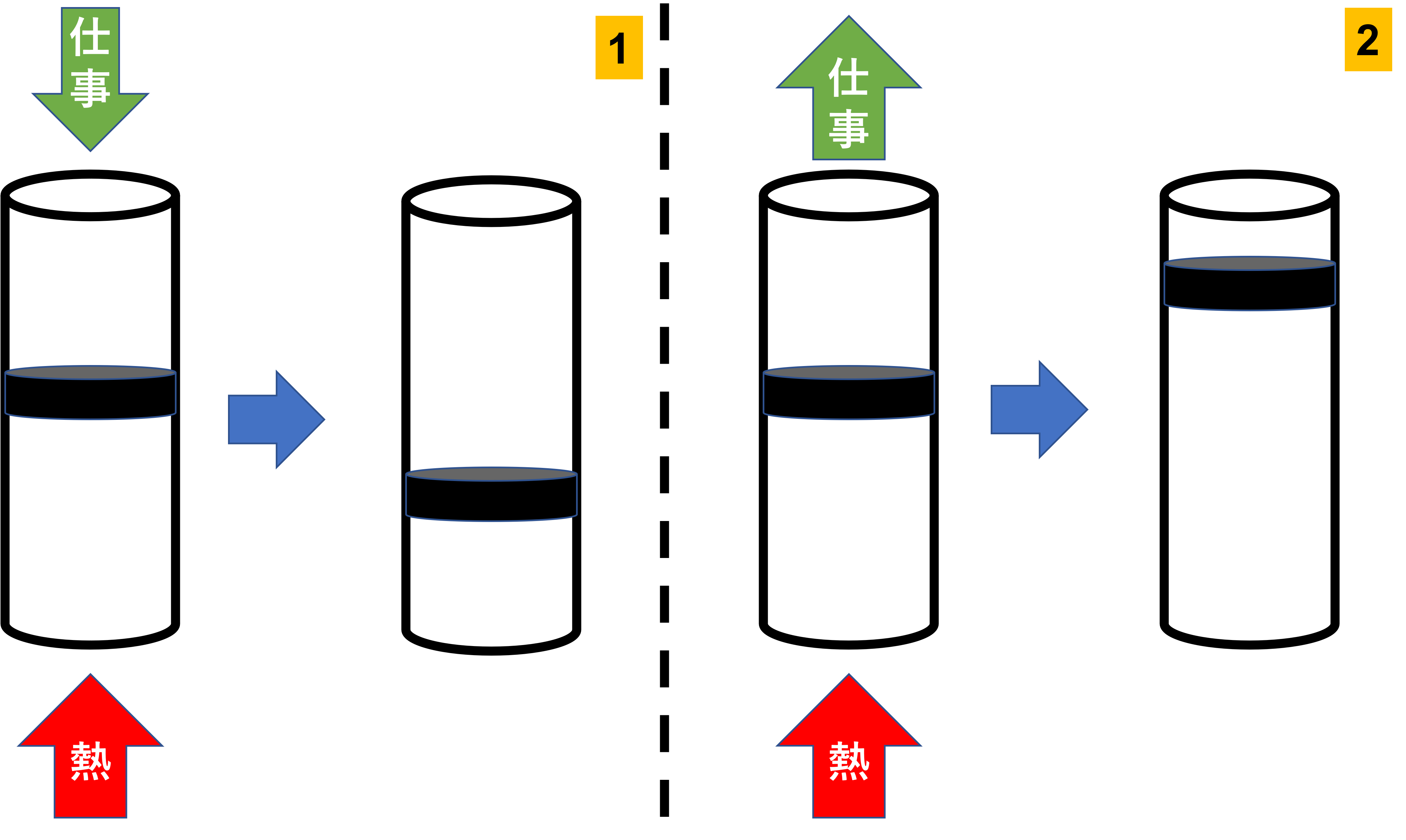 それに対して定容の場合は、体積が一定であるためピストンの移動がなく仕事が行われません。よって定容の時は先ほどのような無駄な熱を消費しません。