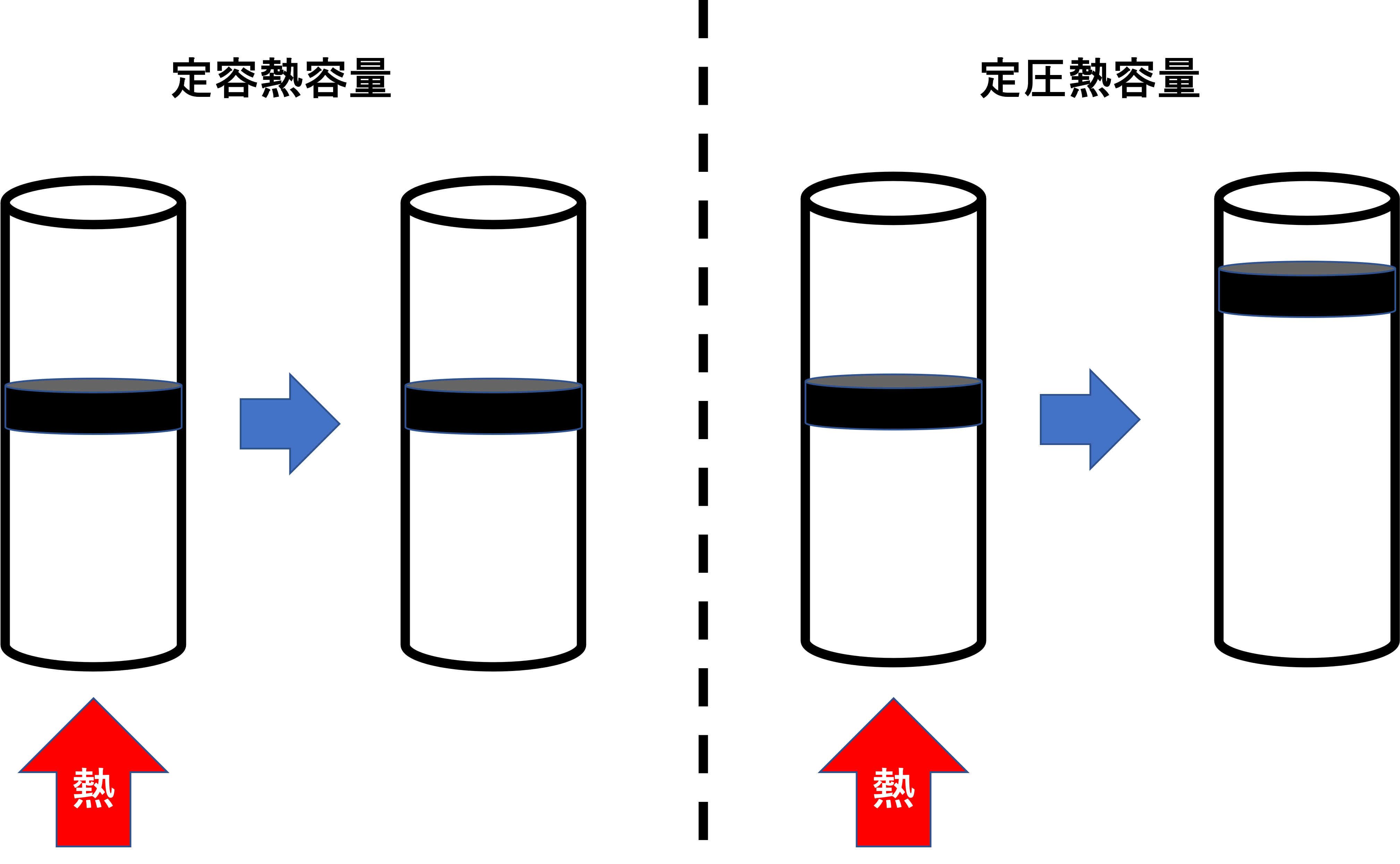 物質の温度を1℃(1K)上昇させるのに必要な熱量を熱容量と言います。さらに物質1gあたりに換算した熱容量を比熱容量と言います。熱容量には以下の2つがあります。
