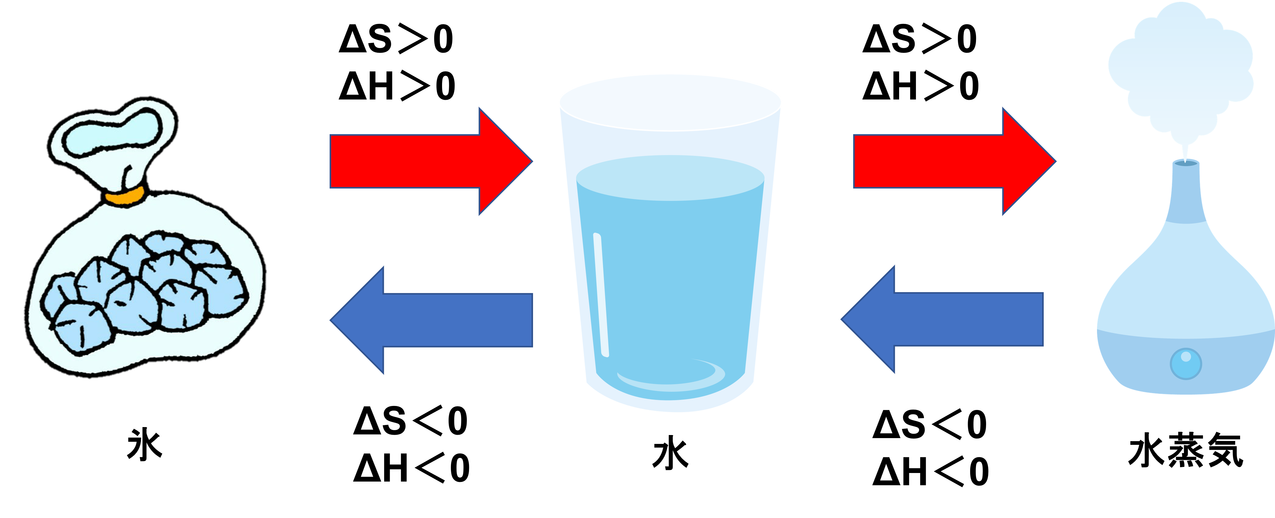 エンタルピーについてはΔH>0は吸熱反応で、ΔH<0は発熱反応でしたね。それがわかっていれば、吸熱することで固体から液体、さらには気体になっていくのがわかると思います。逆に発熱することで、気体から液体、固体へと変わっていきます。