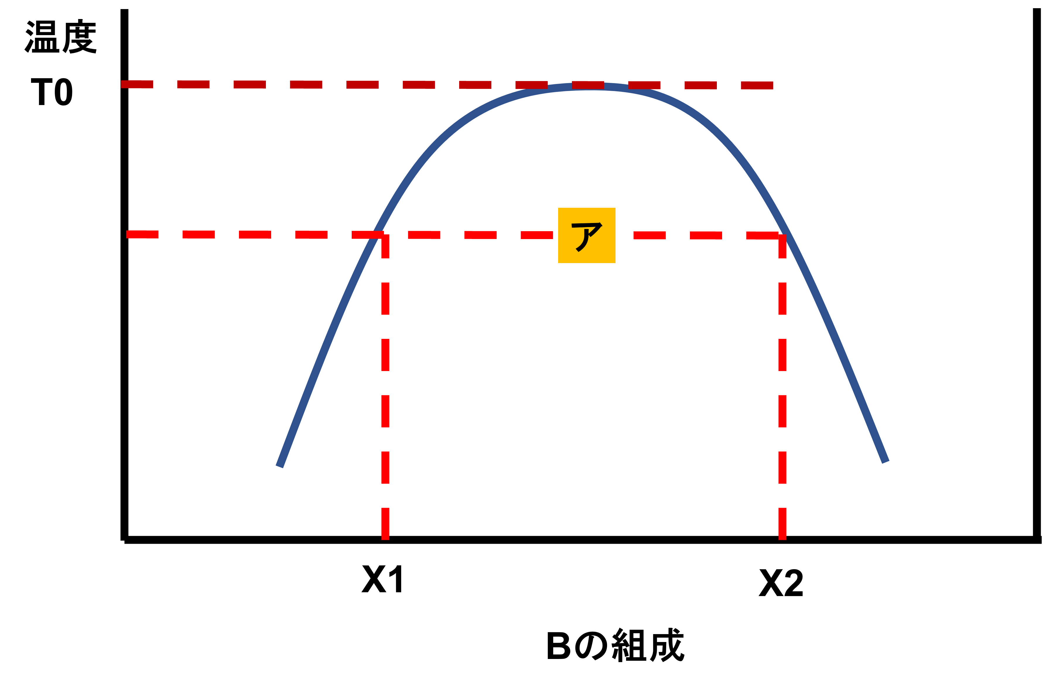 成分Aより成分Bの方が比重が大きい時、「ア」のような曲線の内側では2相に分離しています。イメージとしては以下の図のような感じで、わかれていてもAもBも少しずつは存在しているような感じです。この時上層中のBの組成はX1、下層中のBの組成はX2となります。