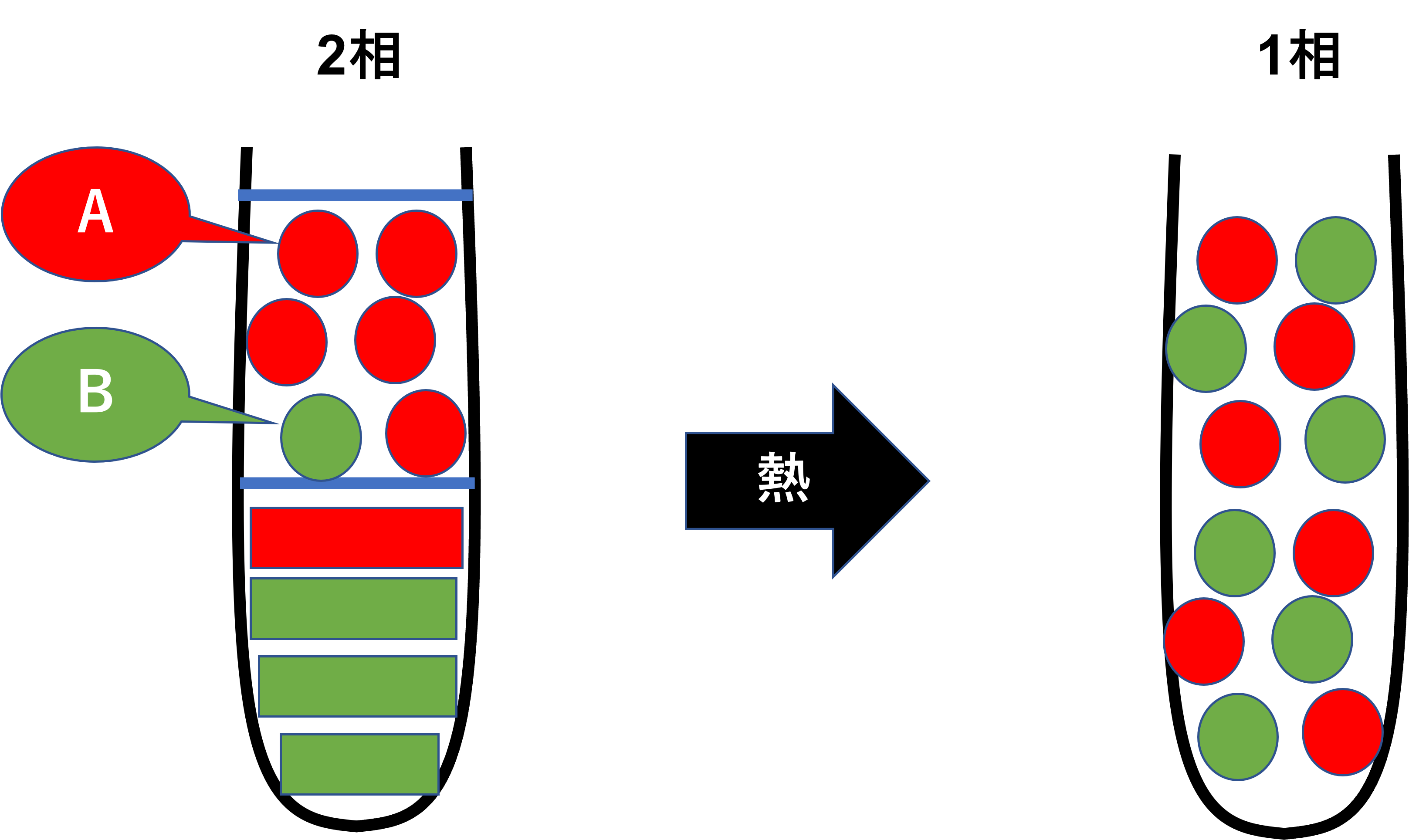 さらに温度を上げていき曲線より外側になると、均一な1相となります。