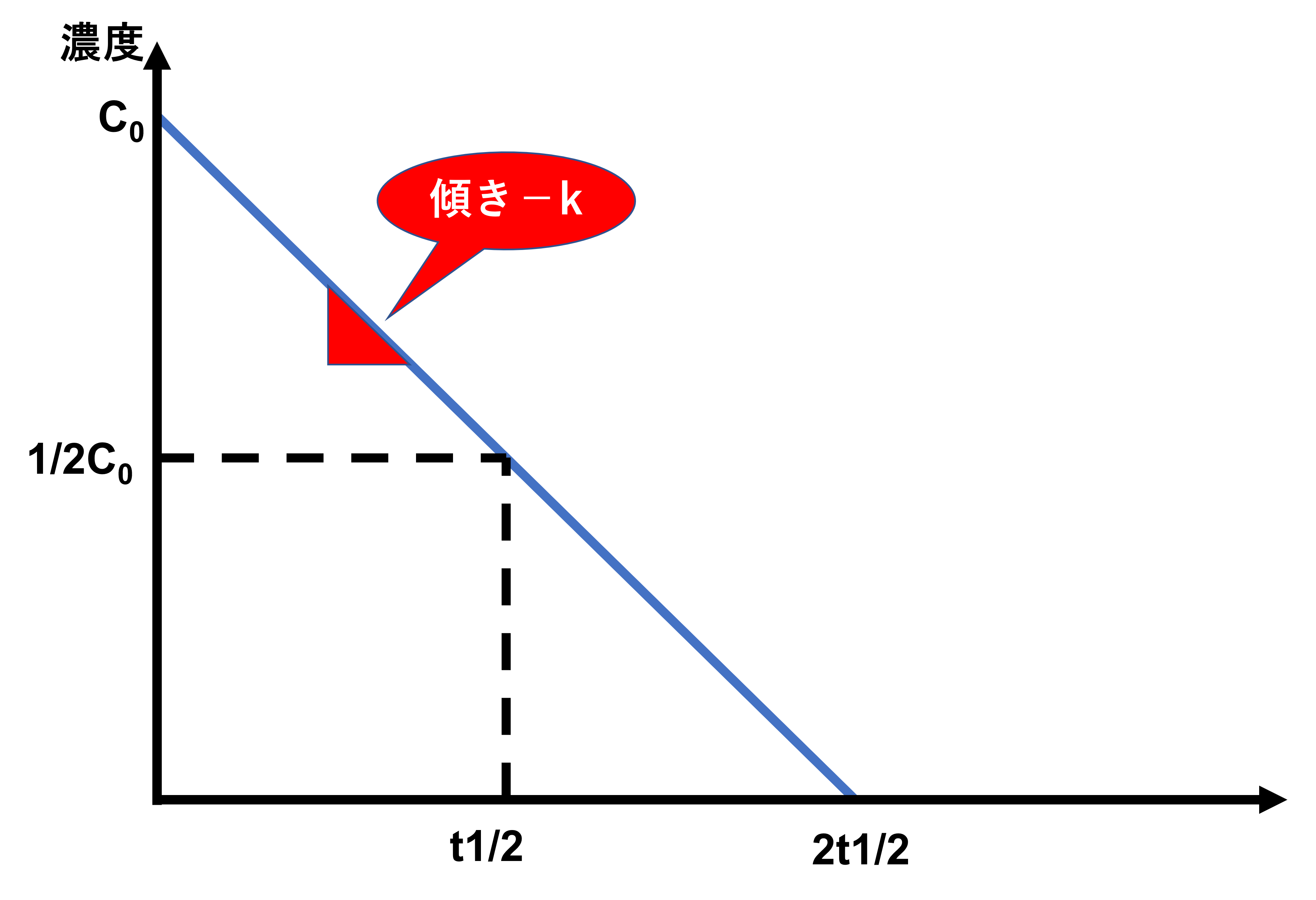 このグラフからわかるように、縦軸の切片はC0、傾きは−kの直線的なグラフです。さらに時間が2半減期以降だとCは0になります。