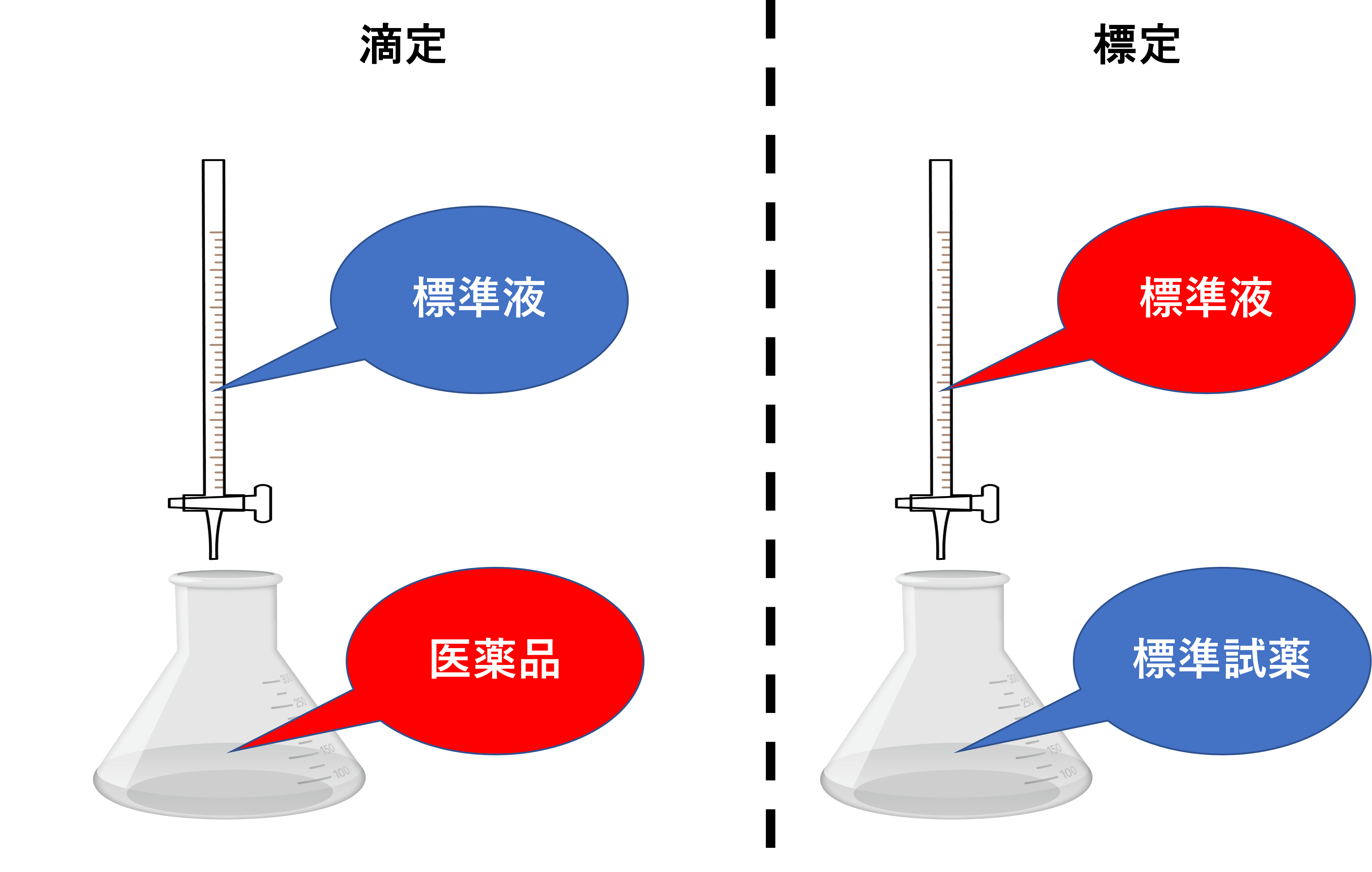 要するに標定では標準液の濃度を調べて、滴定では医薬品の濃度を調べるということです。