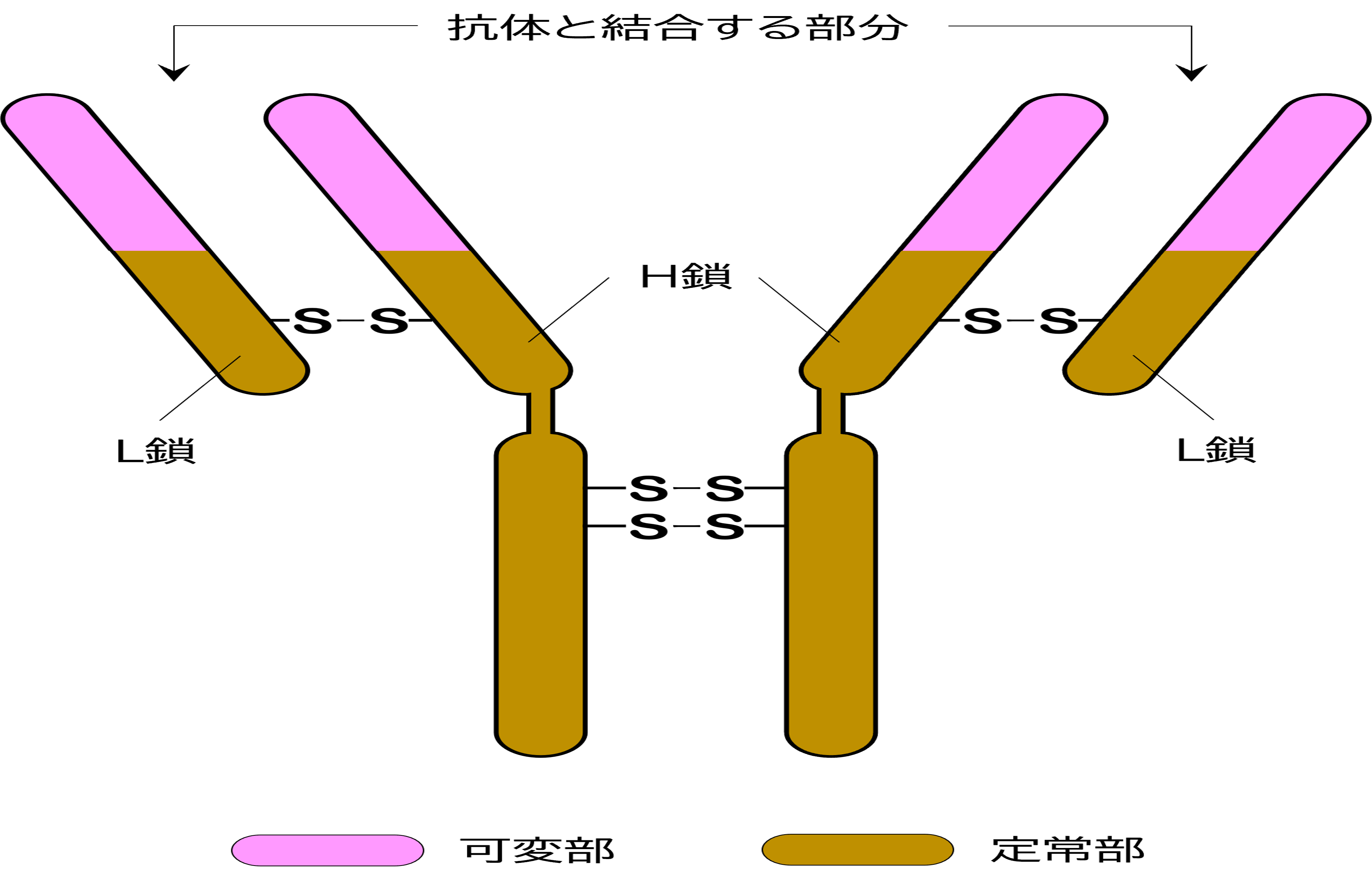 抗原を与えられると体内で作られ、抗原と特異的にくっつくタンパク質を抗体と言います。イムノアッセイには一般的にはIgG抗体が使われます