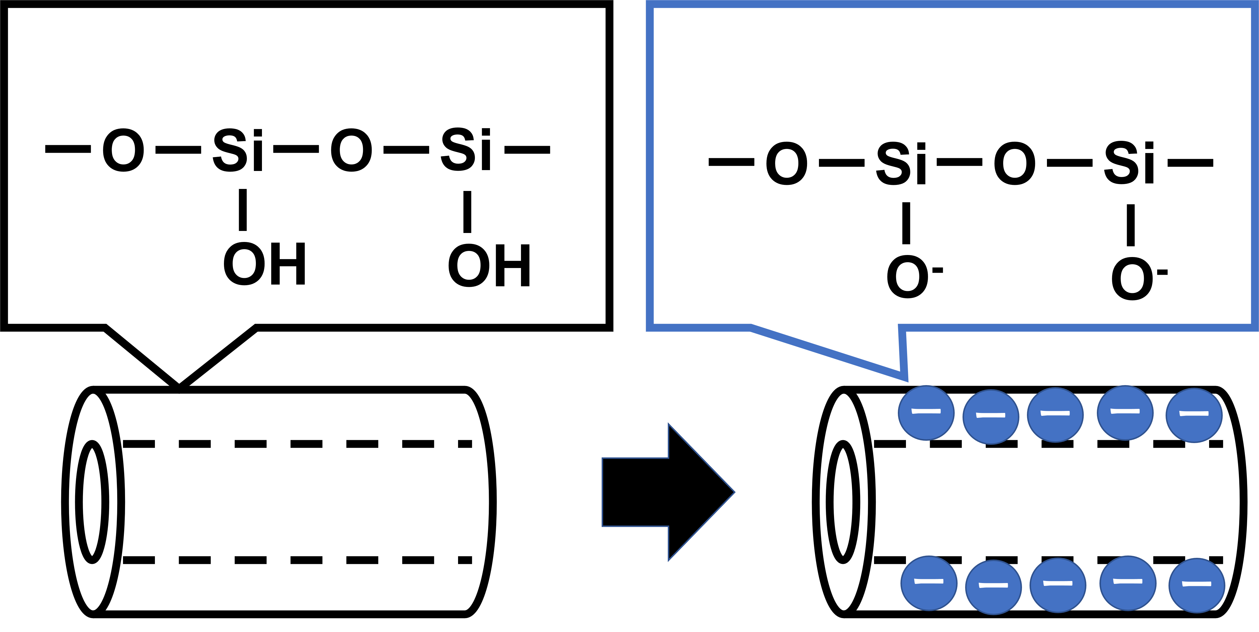 キャピラリー電気泳動法とは、フューズドシリカで作られたキャピラリーと呼ばれる細い管を使って行う電気泳動法です。フューズドシリカのキャピラリーは緩衝液がpH4以上の場合フューズドシリカのシラノール基が解離して表面が負に帯電します。