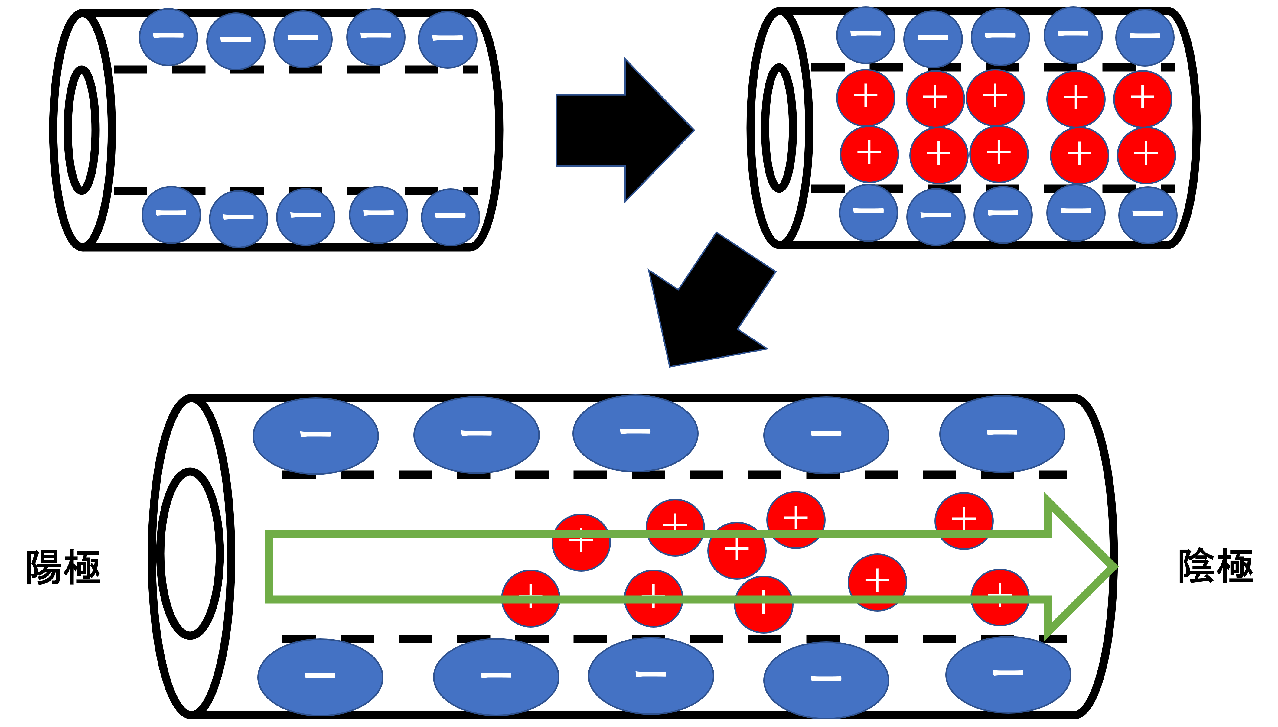 表面が負に帯電するので、電解質溶液中のプラスのイオンが結合して電気二重層が作られます。この電気二重層の状態で電圧をかけると、プラスのイオンが陰極側に引き寄せられるので強い流れが生じます。