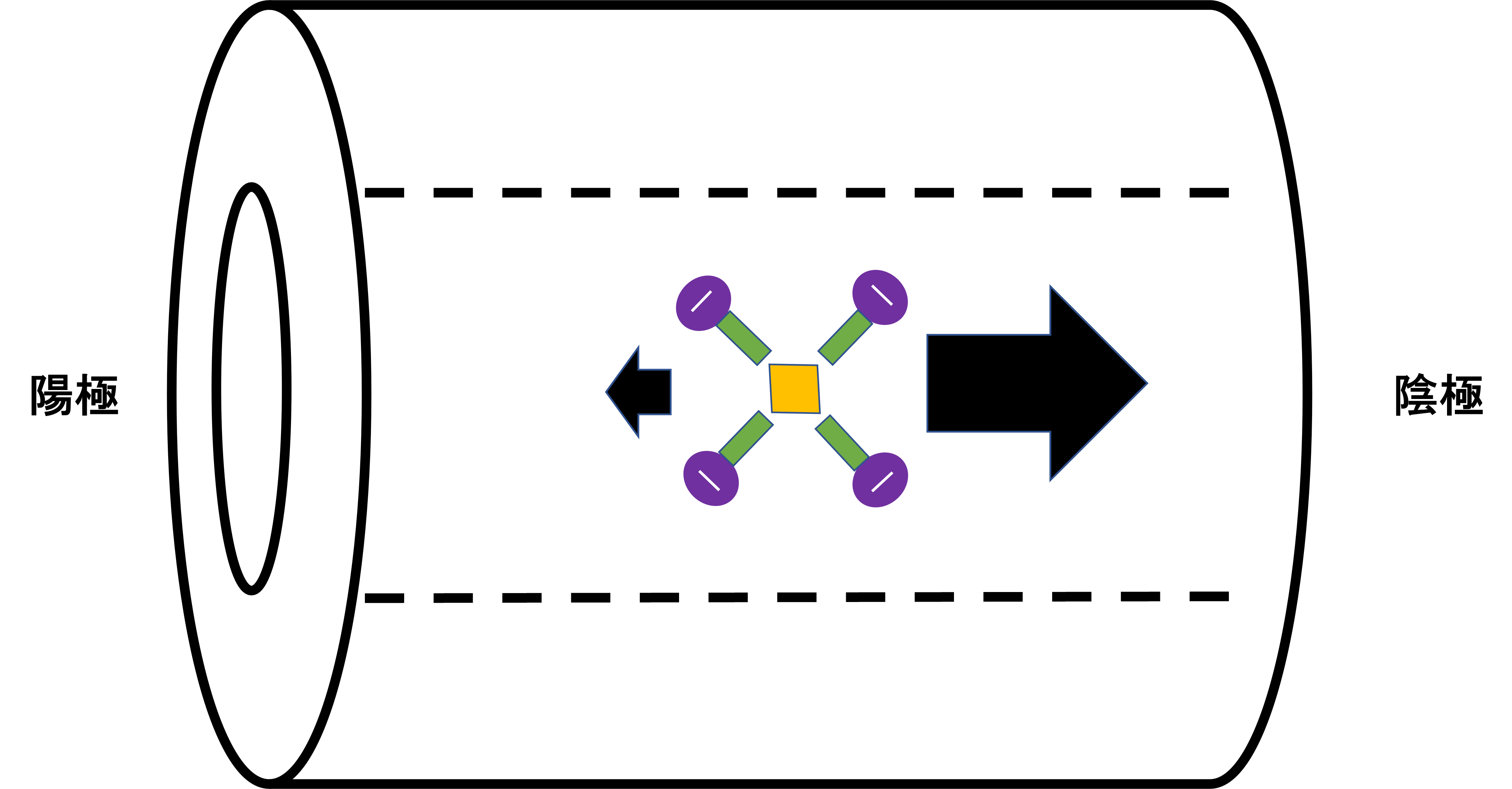 ミセル動電クロマトグラフィーは緩衝液にドデシル硫酸ナトリウム(SDS)などの界面活性剤を添加して電気泳動を行う方法です。陰イオン型界面活性剤であるドデシル硫酸ナトリウムを使うことによってミセルは負電荷を持つため、陽極側へ行こうとしますが、先ほどのイオンの流れの方が強いので陰極側にゆっくりと移動していきます。