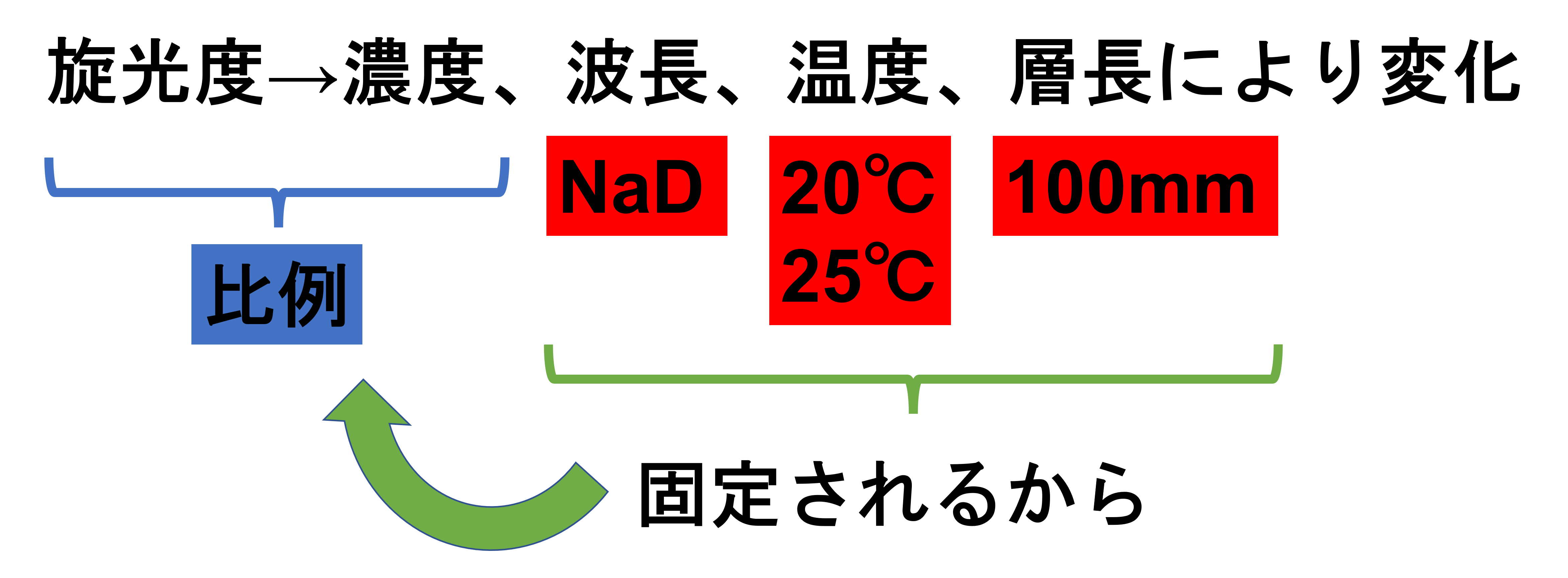 旋光度の値は測定管の層長、溶液の濃度、測定温度、測定波長によって影響を受けます。逆を言えば、旋光度は波長、温度、層長を固定すれば、濃度に比例するとも言えます。そのためこれらを固定します。日本薬局方においては、波長はナトリウムスペクトルのD線、温度は20℃か25℃、層長は100mmで行います。