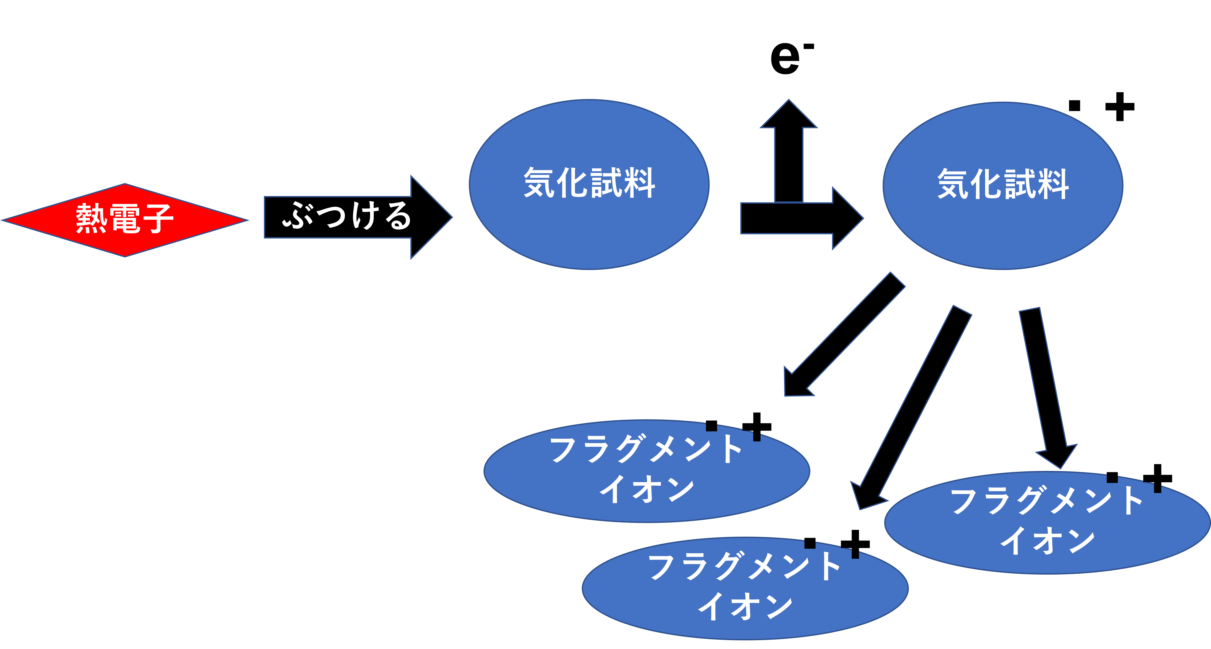電子イオン化法は、高真空下で高速の熱電子を気化した試料にぶつけることで、試料からe-が出てカチオンラジカルを作ることでイオン化する方法です。