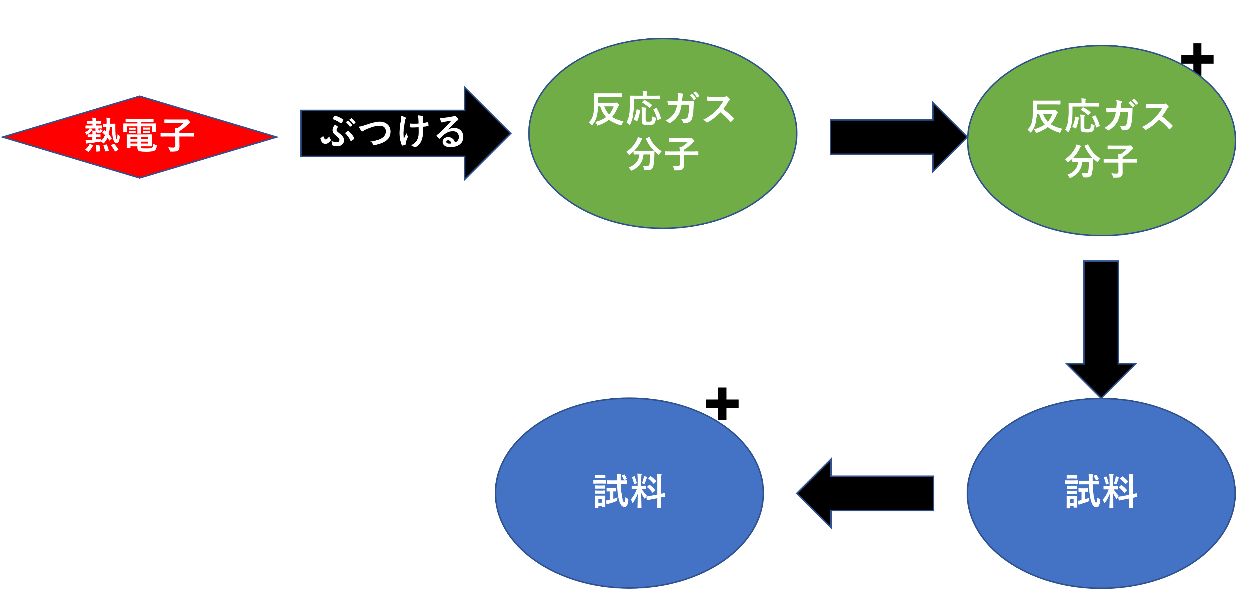 化学イオン化法は、電子イオン化法の改良版のようなイメージです。反応ガスをあらかじめ電子イオン化法でイオン化しておき、これに気化した試料を導入することでイオン化します。