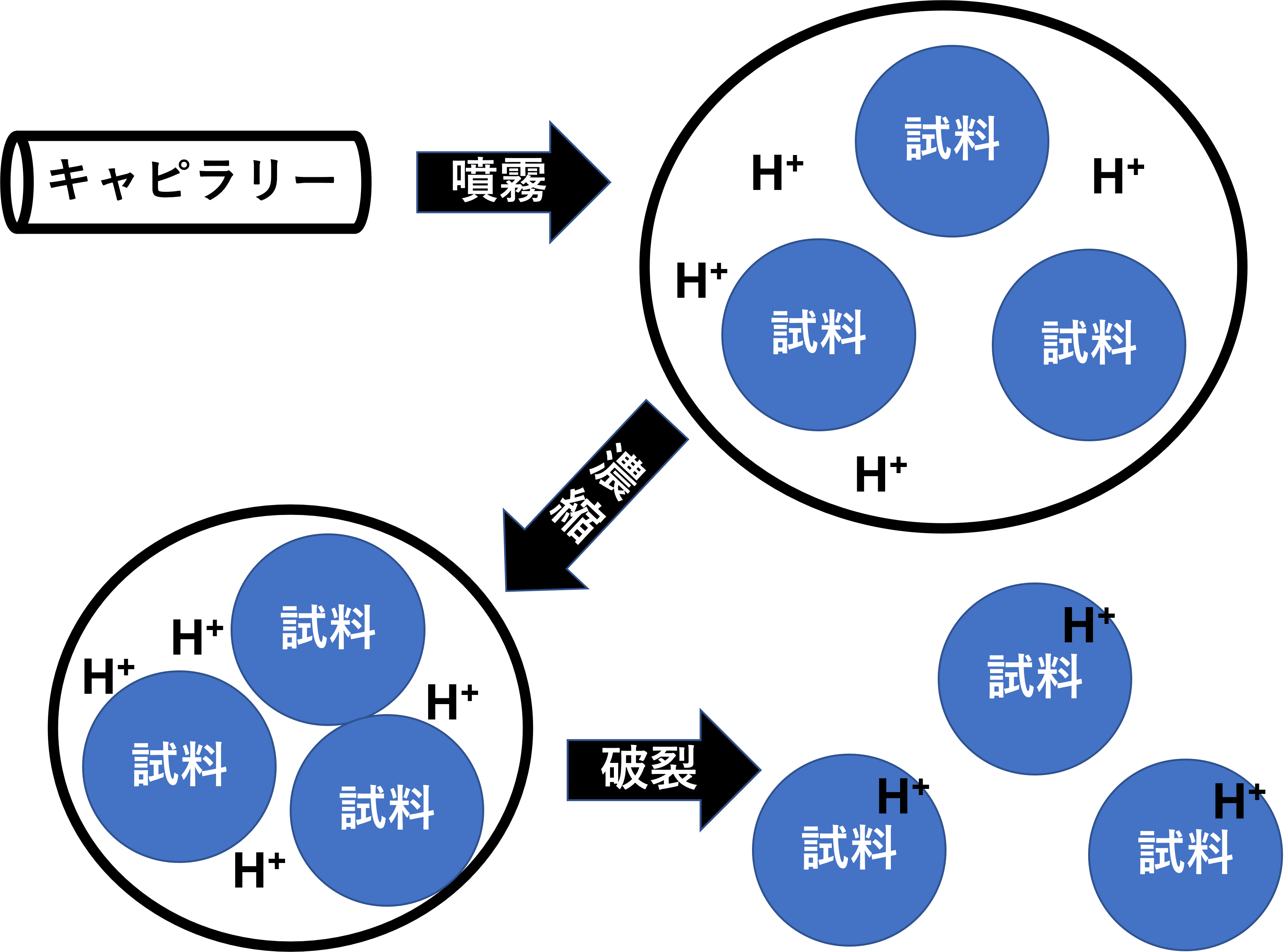 エレクトロンスプレーイオン化法は、液体クロマトグラフィー質量分析(LC-MS)に関わり、高電圧のかかったキャピラリーの先端から試料を噴霧することで霧状の液滴とします。これを加熱して溶媒を減らしていくと電荷密度が上がり、やがて破裂しイオン化することができます。