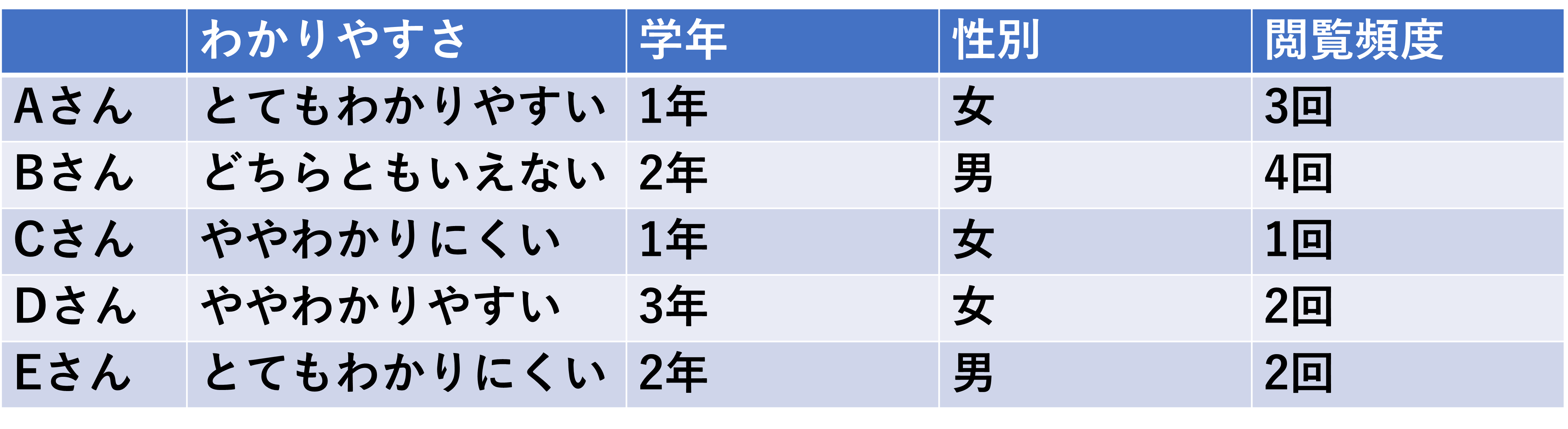 統計学はどうしても数字のイメージが強いですが、その他にも様々なデータが使われます。その様々なデータには測れるものと測れないものが存在します。例えば、当サイトについて以下のようなアンケートを皆様にとったとします。