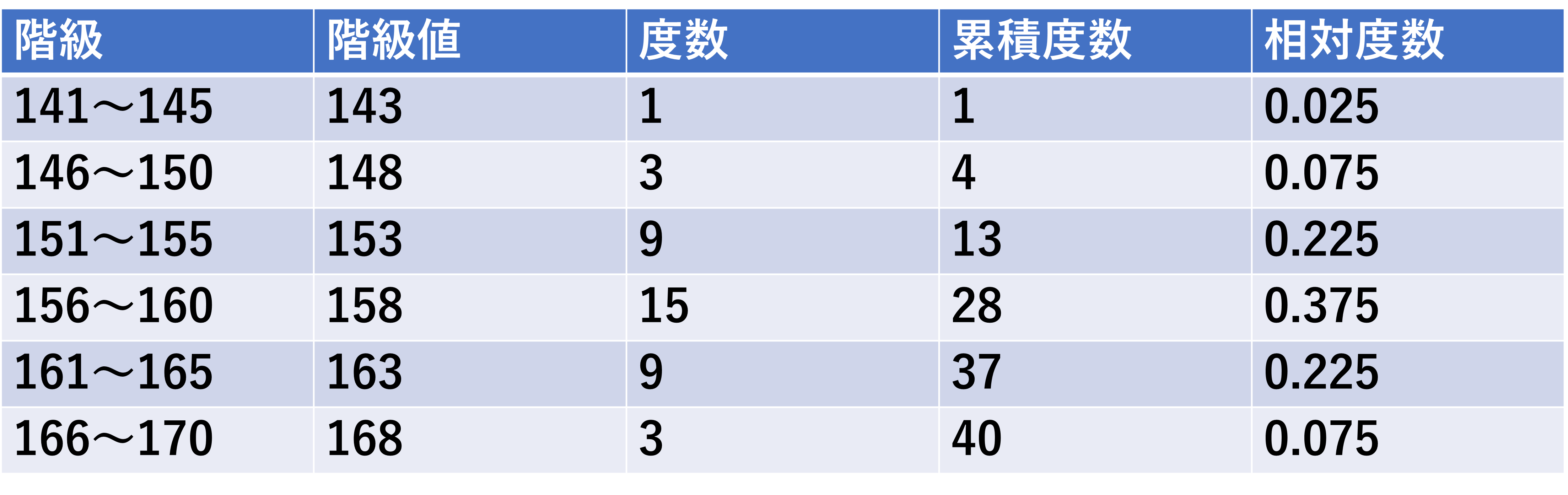 例えば、すでに説明済みですが、156〜160にデータが集まっている。また156〜160を起点にして身長が低い方にも高い方にも左右対称にデータが分布している。などが度数分布表から読み取れます。