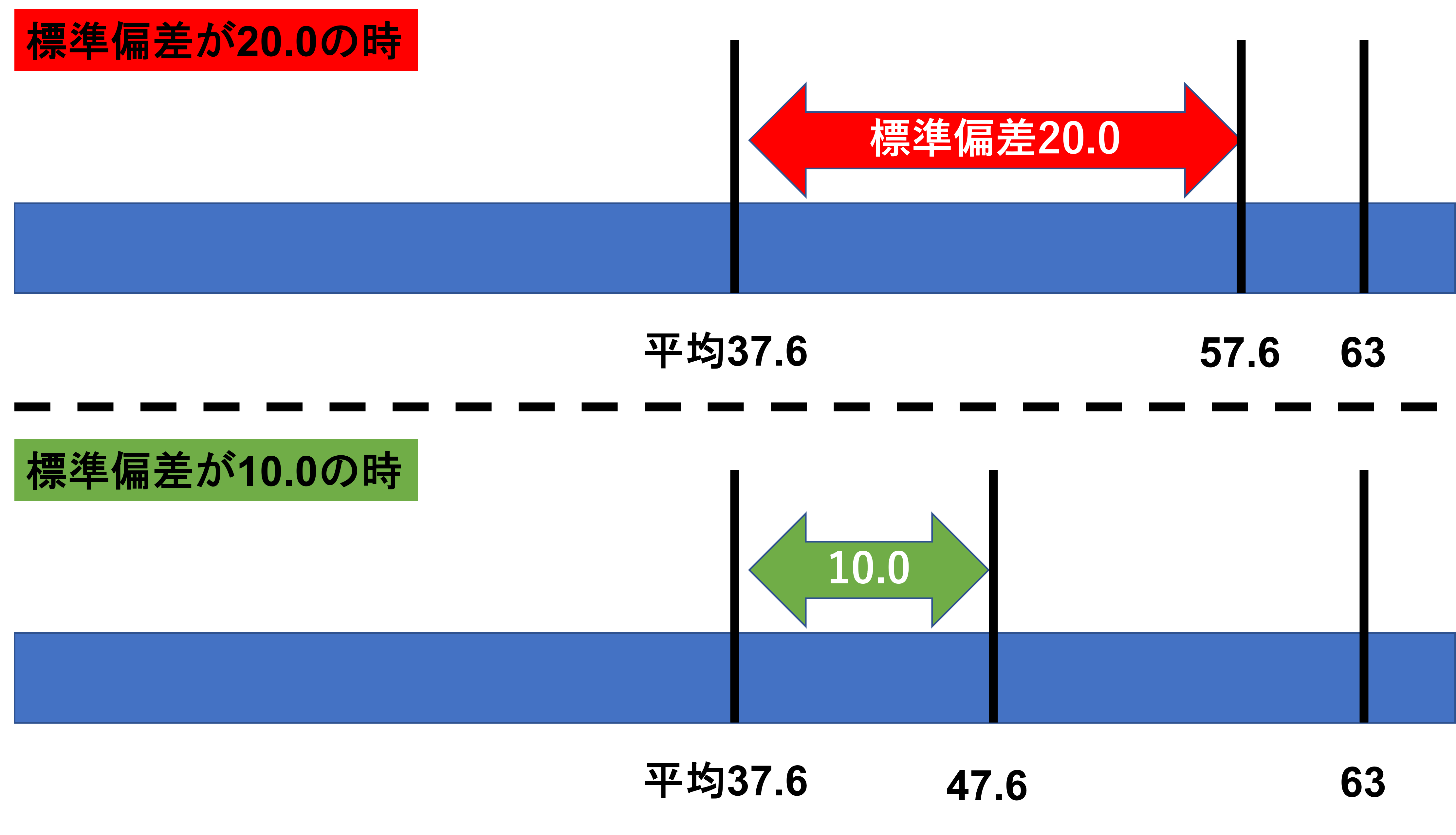 同様に考えてみると、標準偏差一個分では37.6+10=47.6、標準偏差2個分では、37.6+10+10=57.6となります。あなたの63点は、標準偏差2倍以上離れていることになるので、これはかなり特別なデータであることがわかります。そのため、この場合は頑張ったご褒美などをもらえるくらい喜ぶべきデータになります。