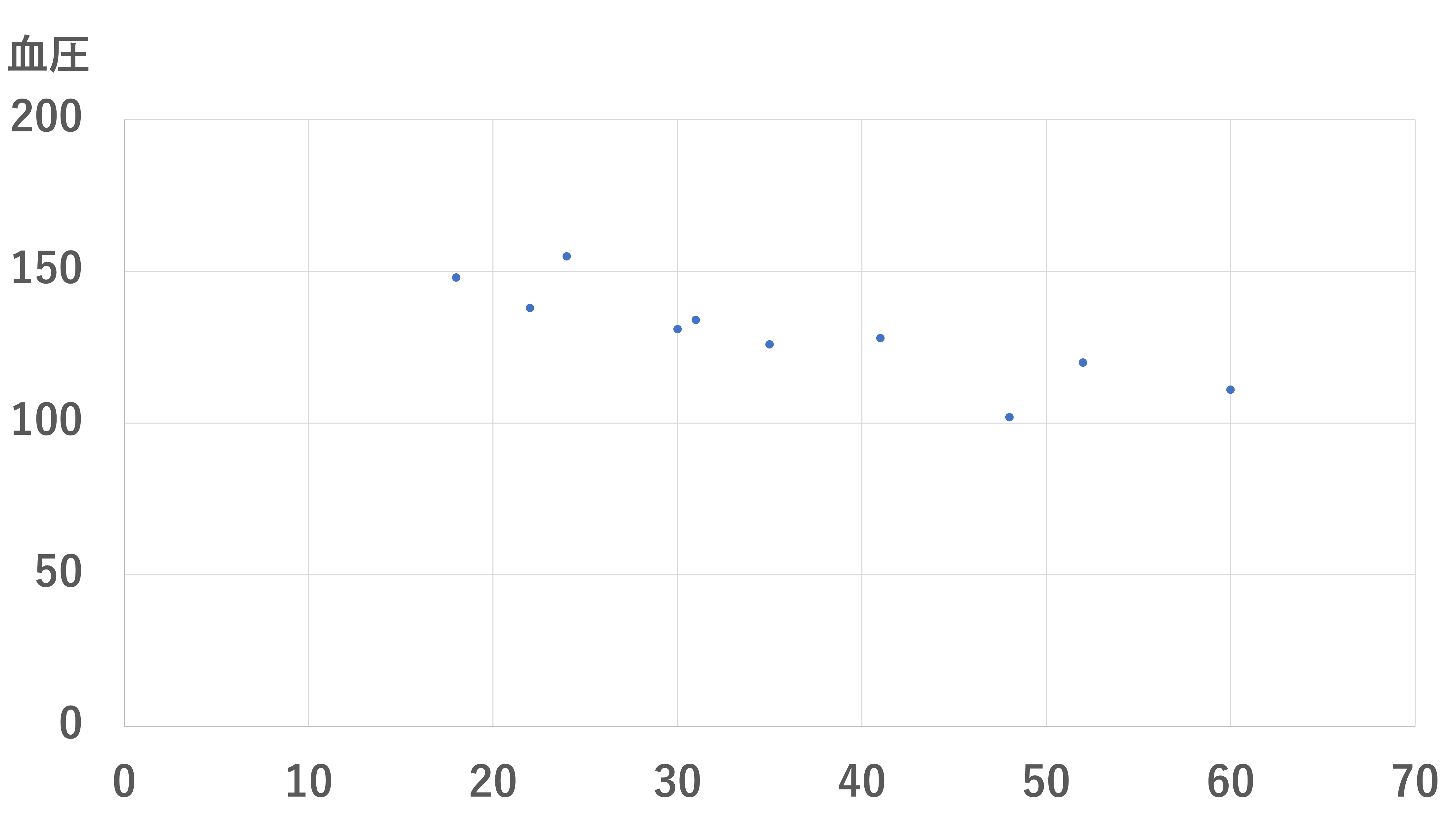 それは年齢が高いほど血圧が下がっていくことを意味しています。なかなか現実的にはありえないですが、前回確認したグラフが右肩下がりのグラフになります。説明用として、グラフの数値を少しいじりました。