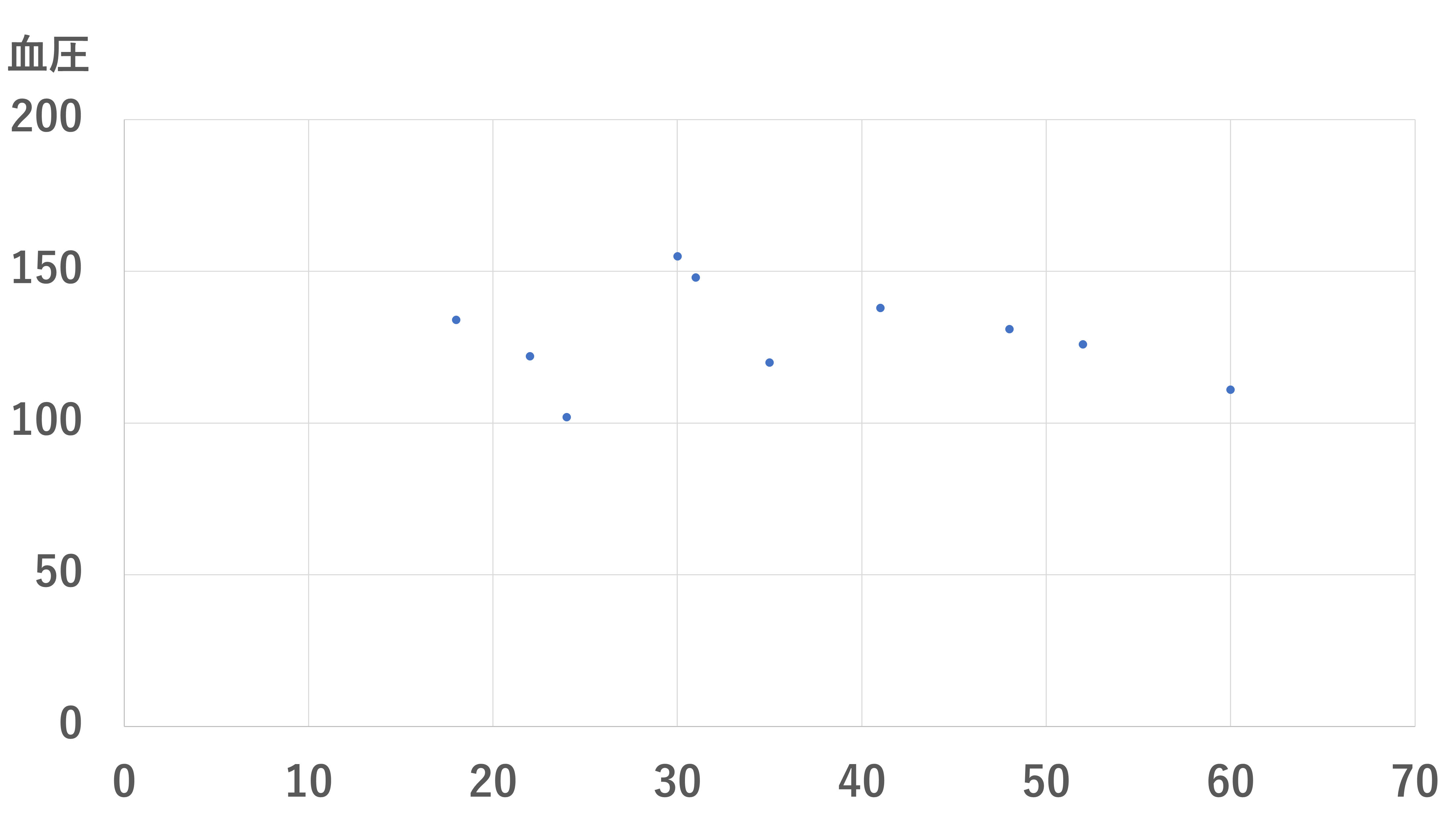 単相関係数が0に近い場合はグラフがいろいろなところに散らばっていて、2変数が関連していない、無関係であることを意味しています。今回の例でいえば、単相関係数が0に近ければ年齢と血圧は無関係と考えることができます。