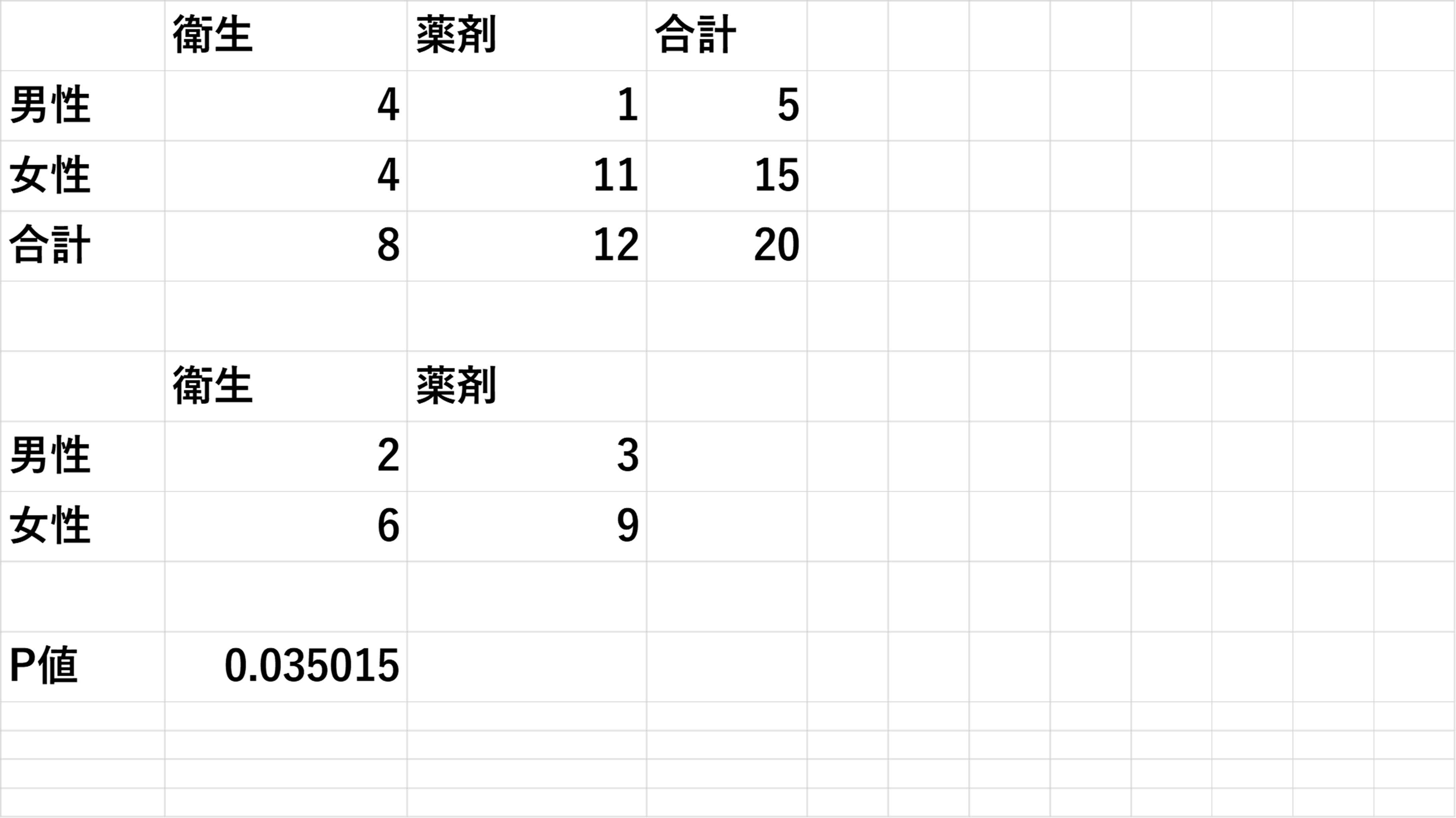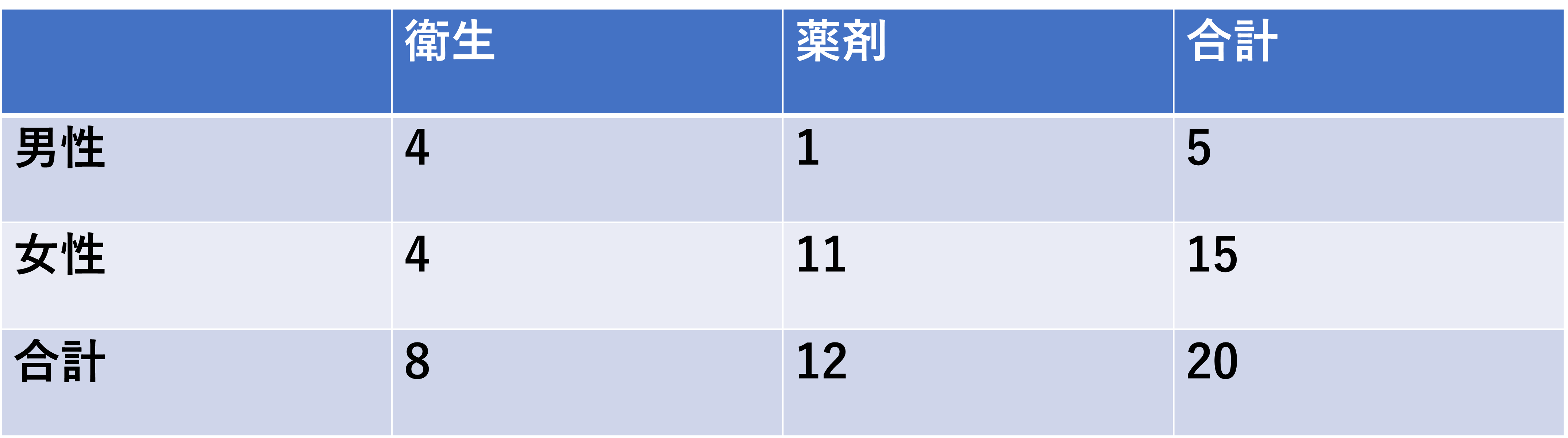 某薬学部の学生からランダムに20人を選び衛生か薬剤どちらの科目が好きかをアンケートして以下の結果が得られた。母集団の某薬学部における性別と好きな科目は関連しているかどうかをP値を用いて独立性の検定により推測せよ。ただし優位水準は0.05とする。
