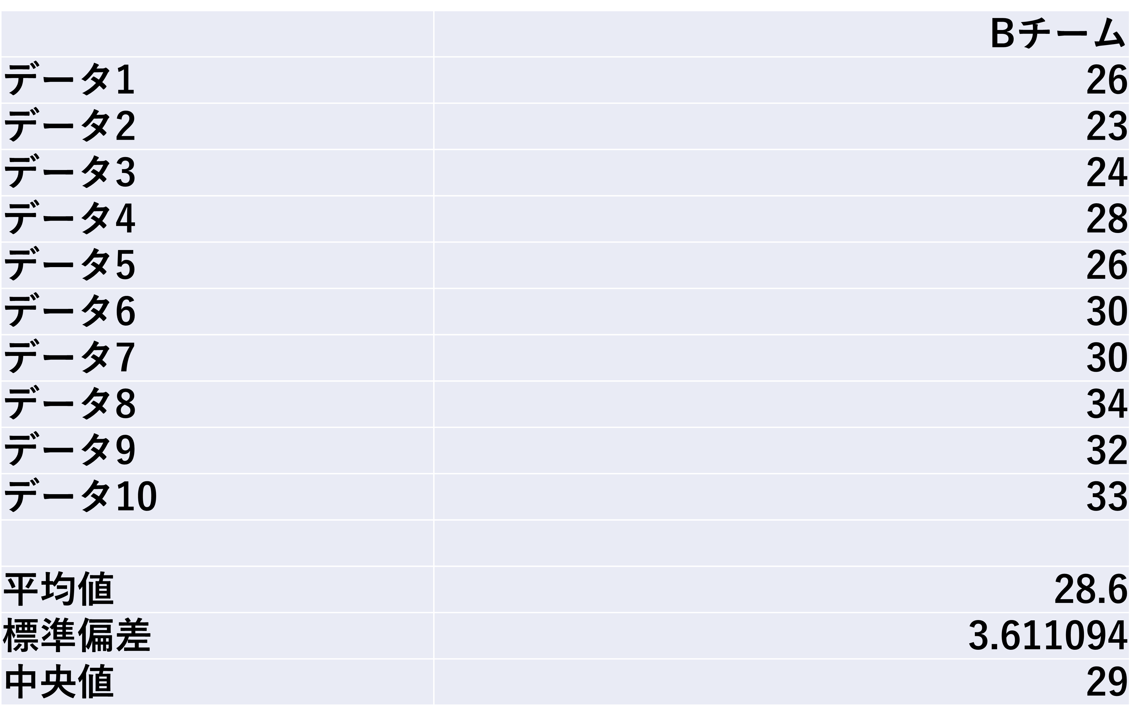 まずはExcelを使って平均値を出してみましょう。使う例題は前回と同じBチームとします。