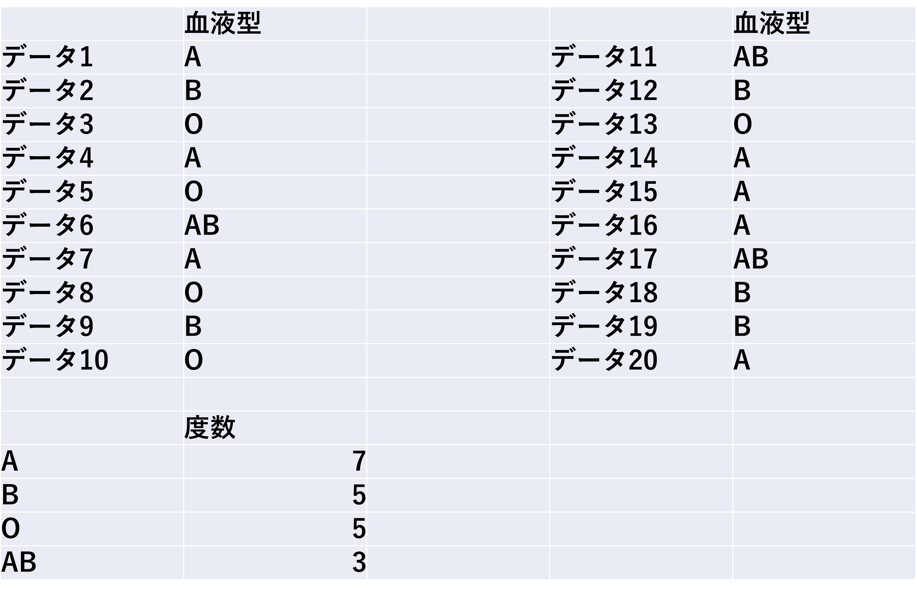 前回最後にやった血液型のアンケートについて単純集計表を作ります。