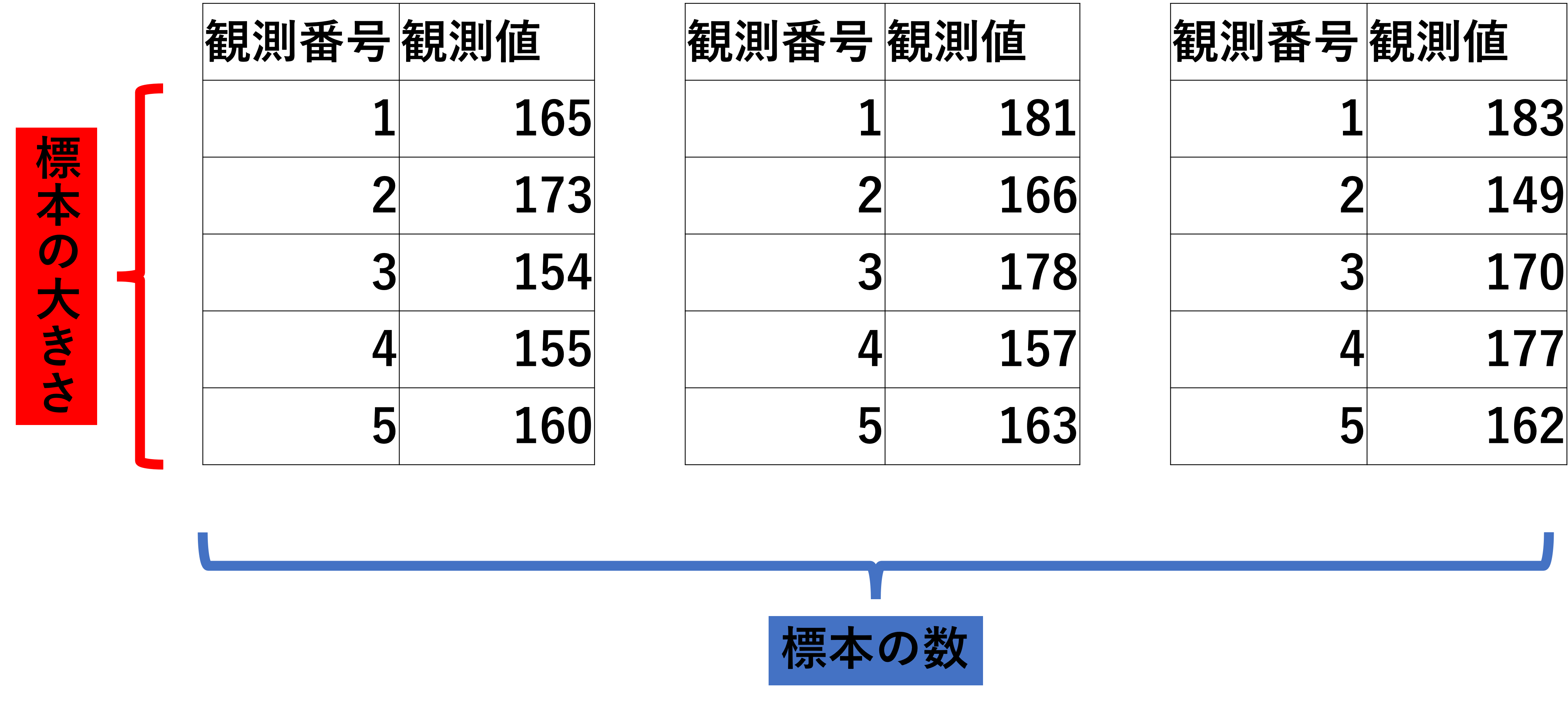 ではこの標本の大きさ5を3セット集めたとしましょう。このセット数のことを標本の数と言います。