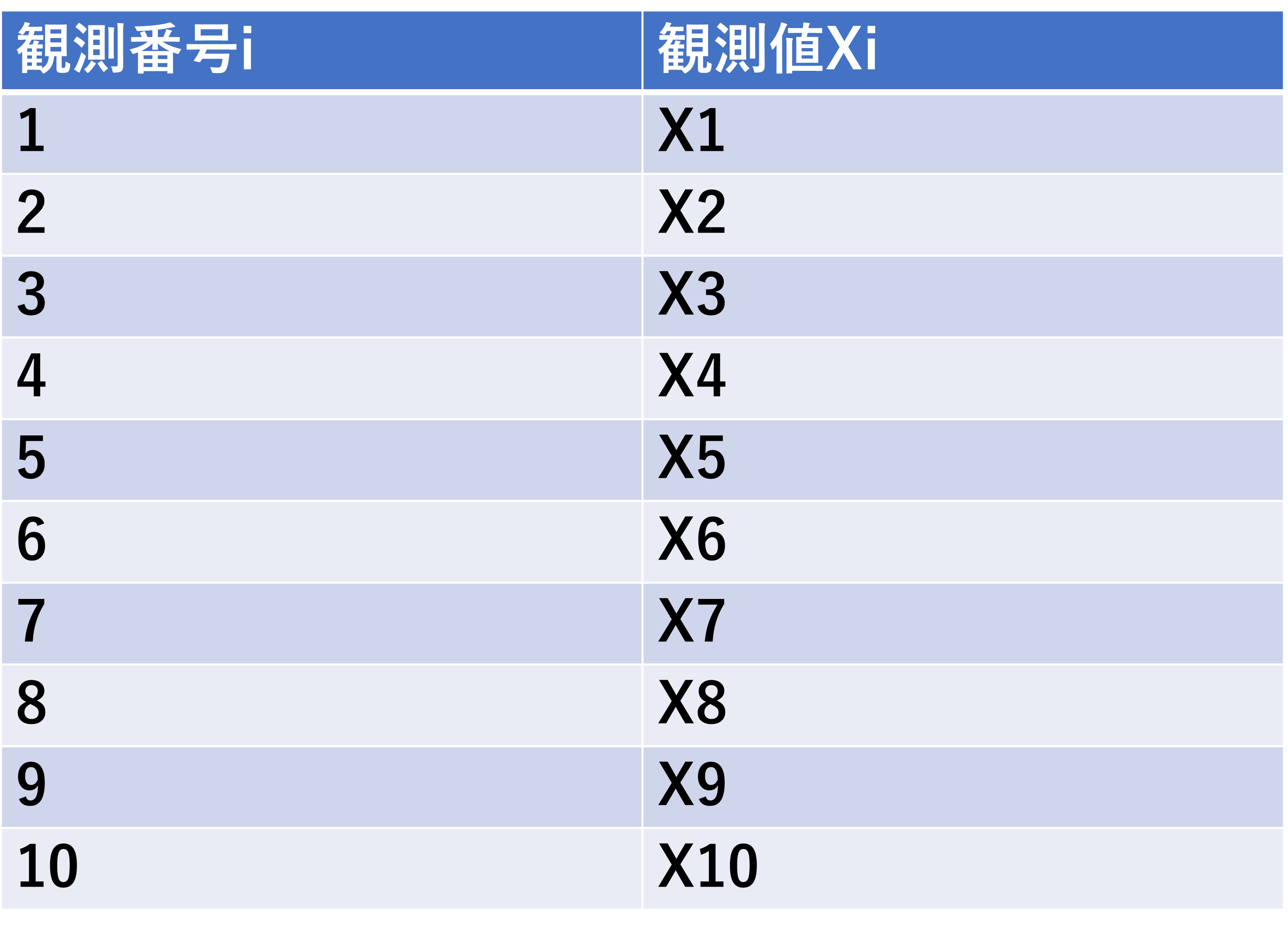 XiのXは変数を表す記号であり、iは添え字(サブスクリプト)と言い何番目のデータであるかを表します。例えばX1であれば1番目の21を表すことになり、X10であれば10番目の33を表すということです。