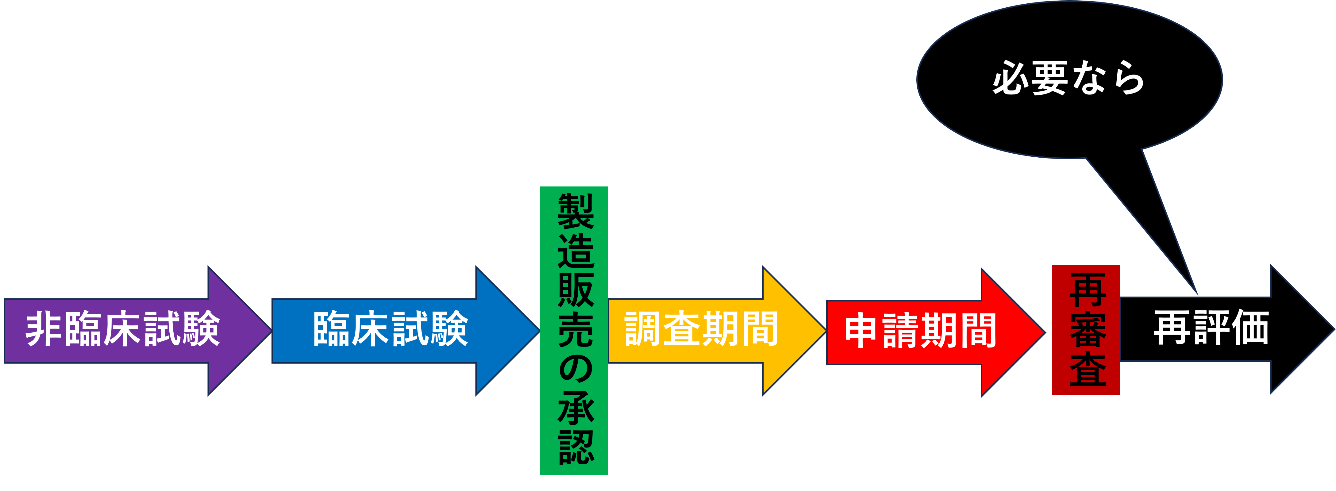 再審査の前に新医薬品を例に、市場に出回るまでの流れを見ましょう。