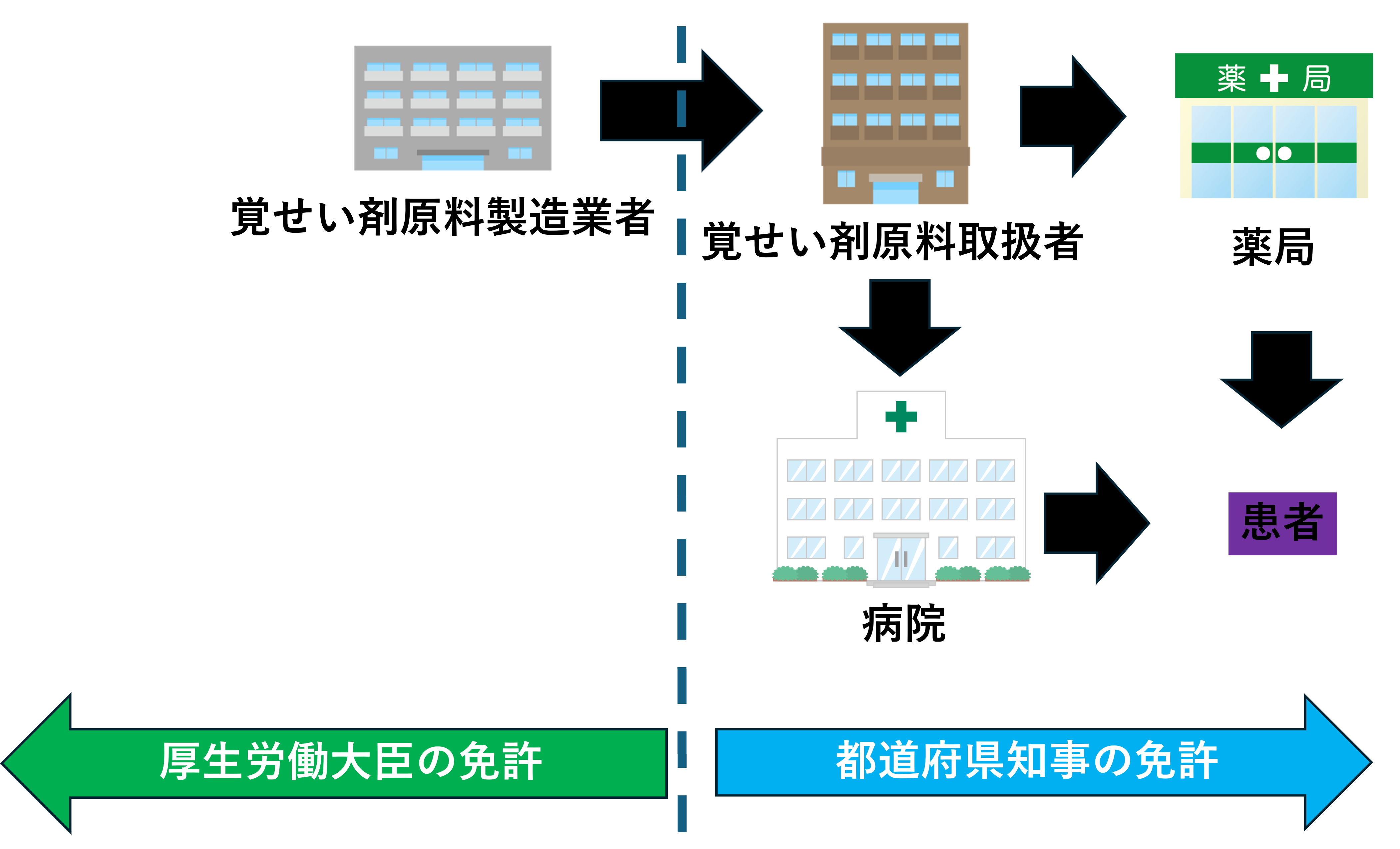 病院や薬局は医薬品である覚せい剤原料に関わる業務に限り、覚せい剤原料取扱者の指定なく取り扱うことが認められています。そのため覚せい剤は薬局では扱えませんでしたが、覚せい剤原料は取り扱うことができるのが大きな違いです。