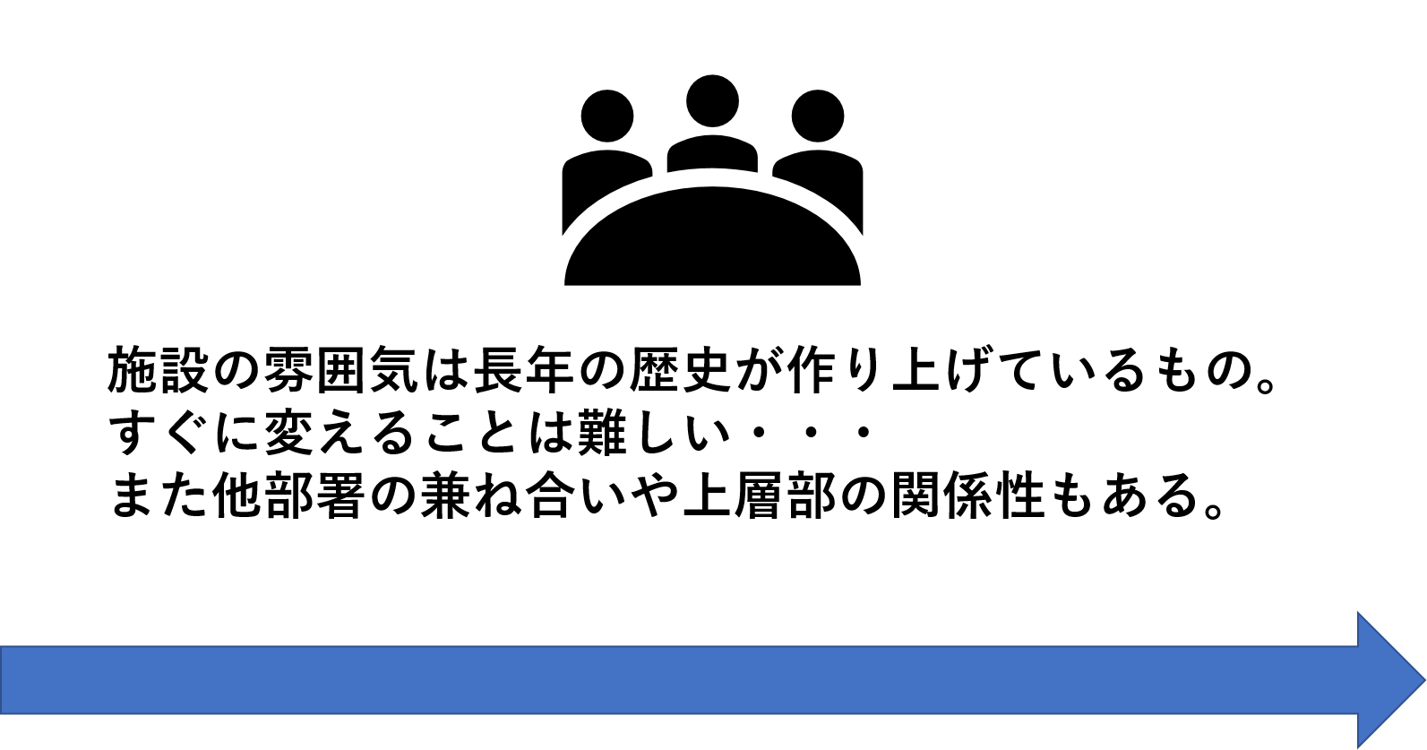 「職場の雰囲気や人間関係って大事だよね」という話をよく聞きます。常にピリピリしている施設は、人に聞きにくい環境となり、会話が少なく個人プレーになる傾向があります。逆にアットホームな施設は、緩い分ダラダラと仕事をする傾向があります。