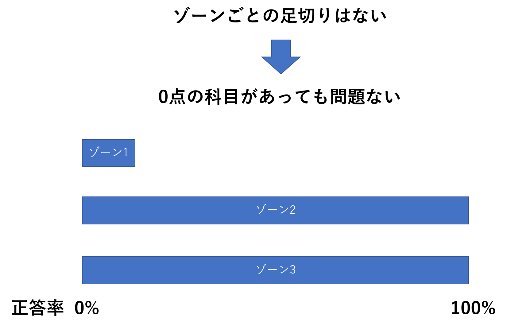 何が言いたいか、わかりますか?満遍なく出来る必要がないのです。極端な話、ゾーン1が0点で、ゾーン2とゾーン3が満点なら問題なく合格ということになります。これを意識して勉強することで効率よく取り組めます。
