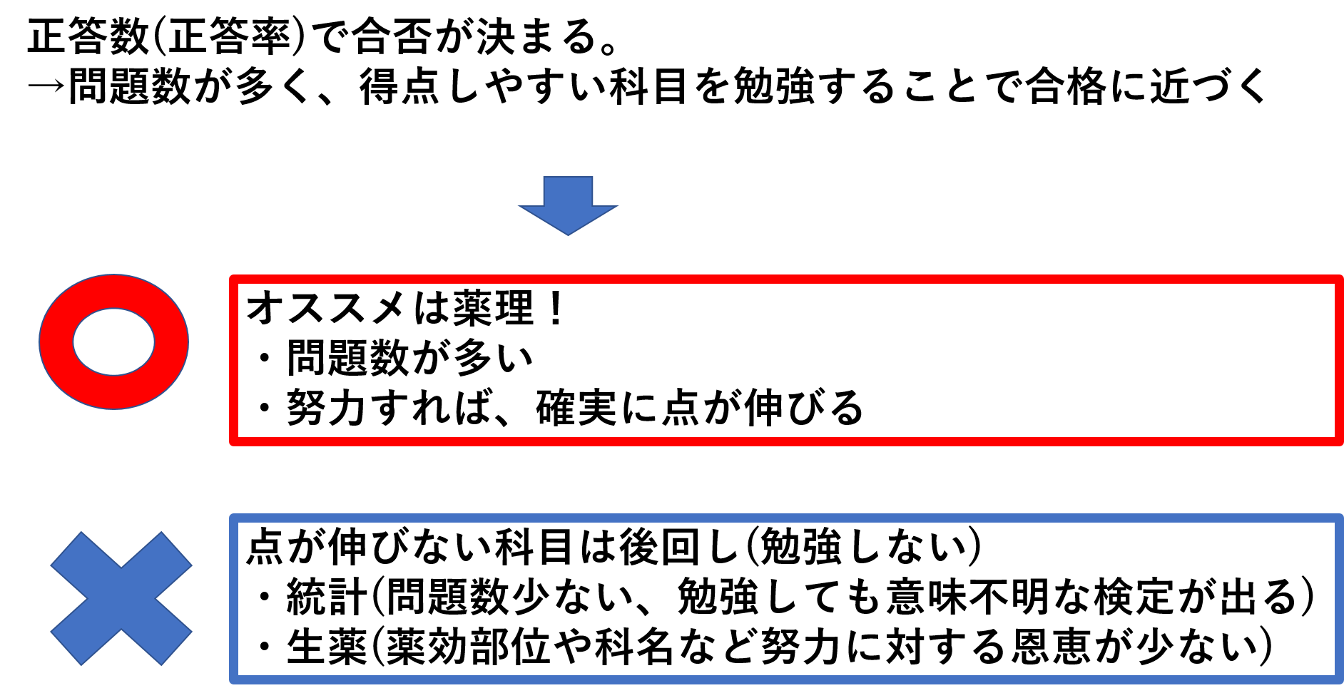 わかっていると思いますが、努力しても点数に繋がらない分野や問題数が少ない科目は後回しにしましょう。例えば、統計学や生薬の分野です。極端に言えば、これらの科目は、勉強しなくてもいいと思います。CBTは記述問題ではなく、選択問題なので運任せで点が取れる可能性があります。