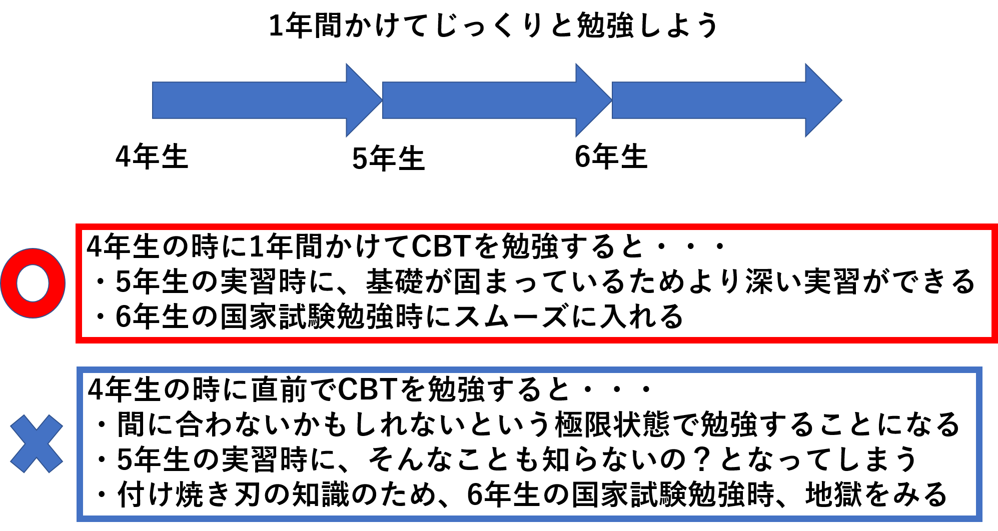 なぜかと言うと、国家試験の勉強の基本となるからです。CBTの試験レベルは、国家試験の基礎問題と同じくらいのレベルだと思います。国家試験を合格するためには、いかに基礎問題で点を取れるかにかかっています。CBTを本気で勉強しておけば、6年生になって、いざ国家試験の勉強を始めるときにもスムーズに入れます。