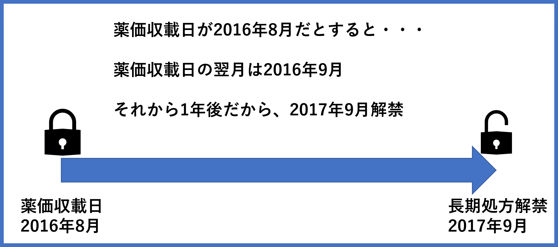 日本語が難しく、よくわからないので、例をあげます。例えば薬価収載年月が2016年8月に記載されていたら、2017年の9月に処方日数が14日以上出せることになります。