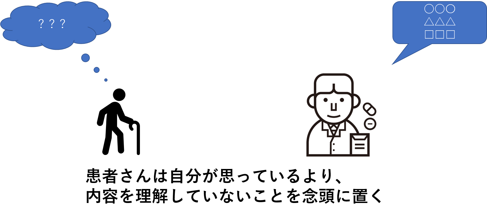 もうあなたが先生で、患者さんが生徒の状況です。あの時の同じ過ちを繰り返してはいけないのです。基本中の基本ですが、わかりやすい言葉を心がけましょう。