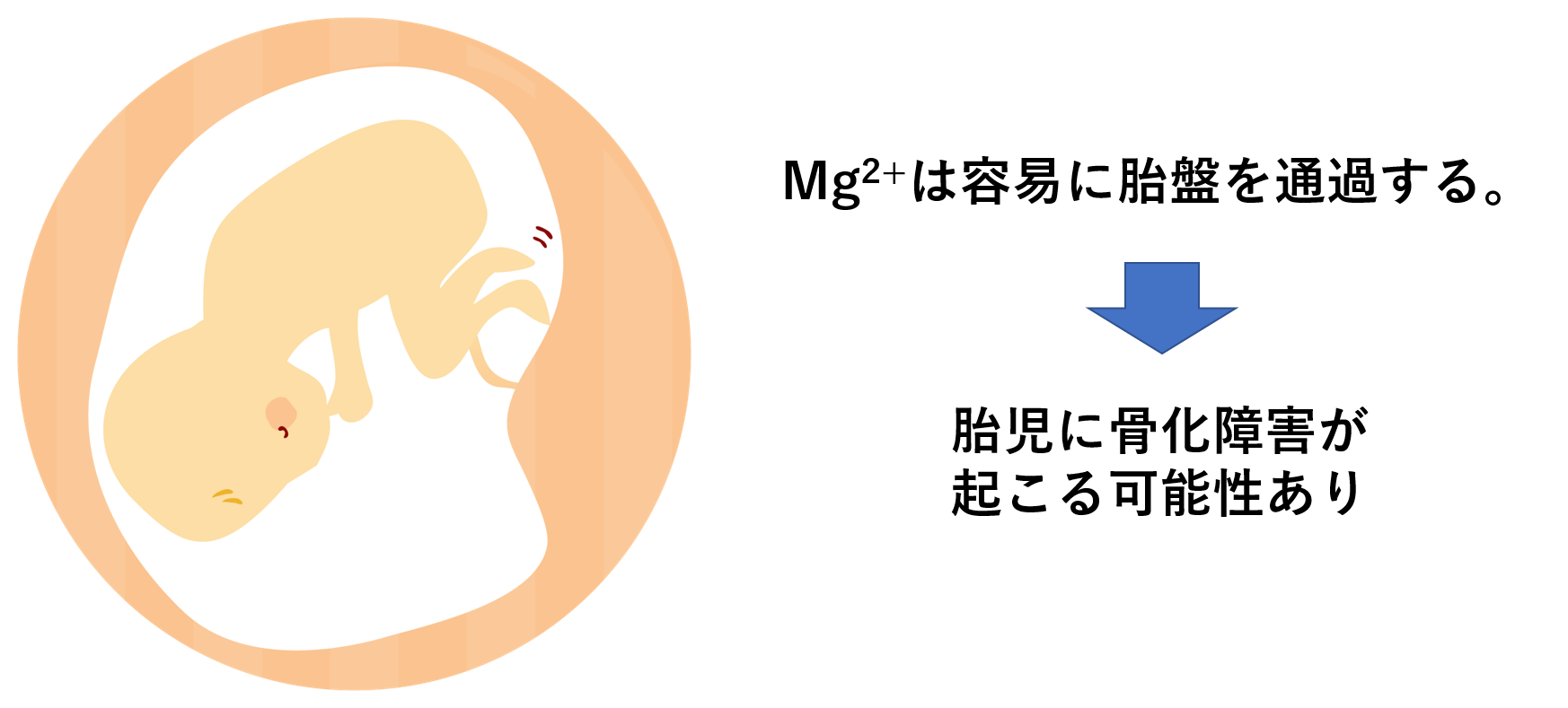 他剤であるが、マグセント(硫酸マグネシウム、ブドウ糖液配合)などは婦人科系の薬として使われる。今回の硫酸マグネシウム補正液もその名の通り、「硫酸マグネシウム」を含む。Mg2+は胎盤を容易に通過して胎児にも影響を与えてしまう。よって胎児に骨化障害が起こる可能性がある。
