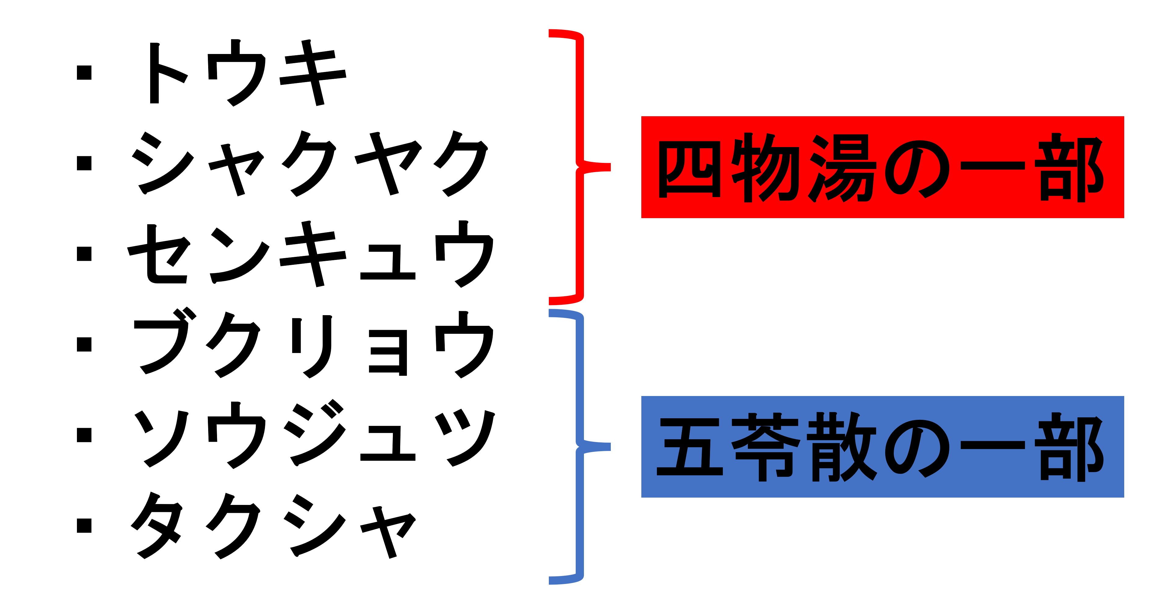 当帰芍薬散の構成生薬のうち、トウキ、シャクヤク、センキュウは血虚の漢方薬の代表である四物湯の一部、ブクリョウ、ソウジュツ、タクシャは水毒の漢方薬の代表である五苓散の一部、これらが混ざっている。
