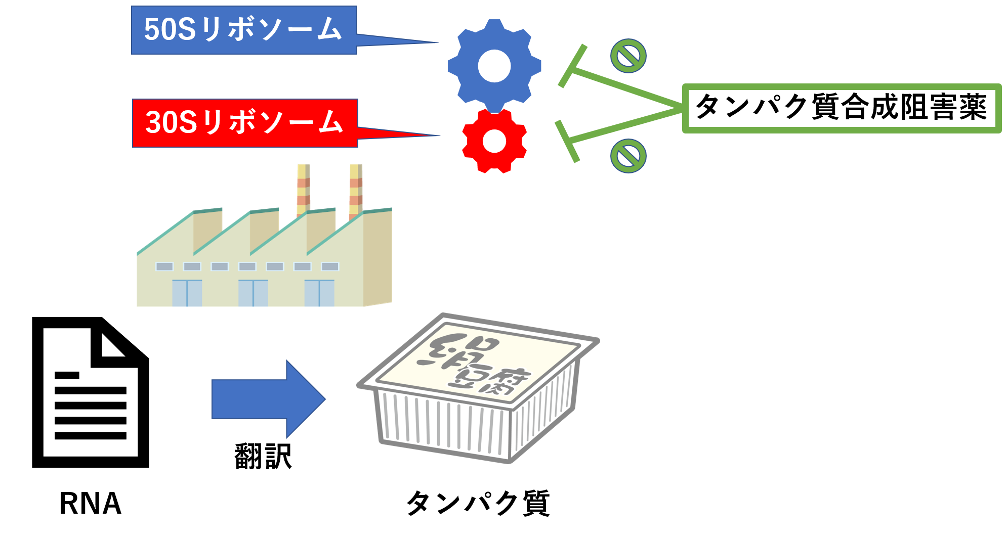 トブラシン点眼(トブラマイシン)はアミノグリコシド系であり、タンパク質合成を阻害して作用する。