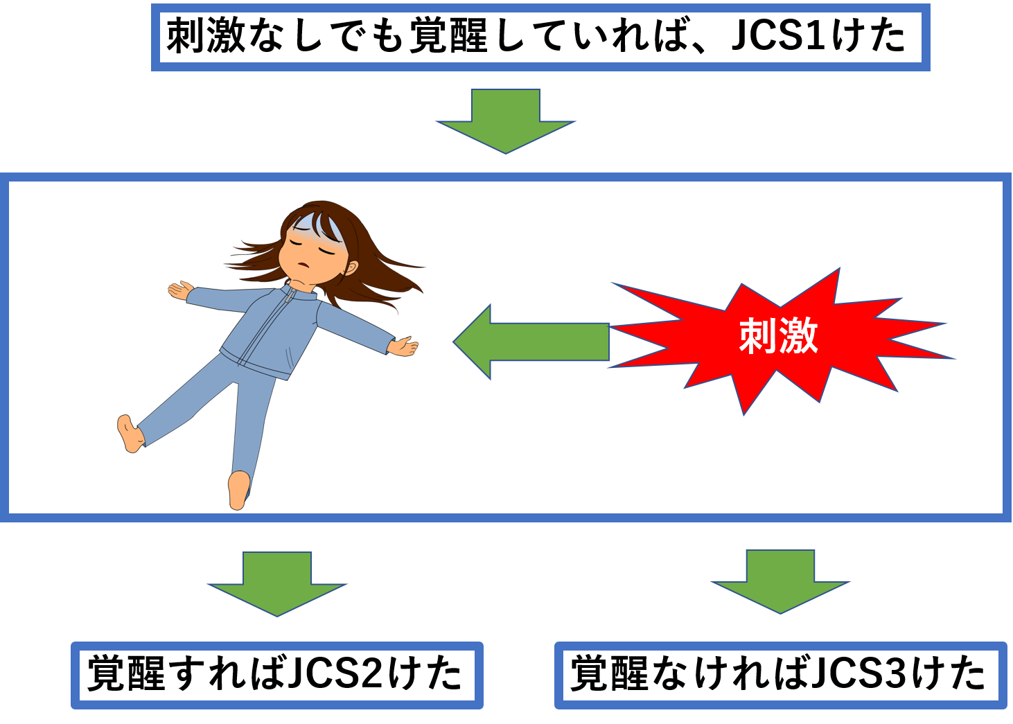 4点は痛みに対して手足を引っ込めます。3点は痛みに対して胸の前で腕をМの字の形に合わせるような動きがみられます。これは大脳皮質に障害が起きたときに見られる反応です。2点は痛みに対して手足が伸びる動きがみられます。これは中脳などに障害が起きたときに見られる反応です。