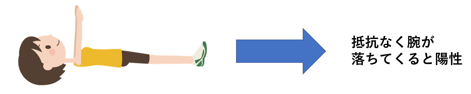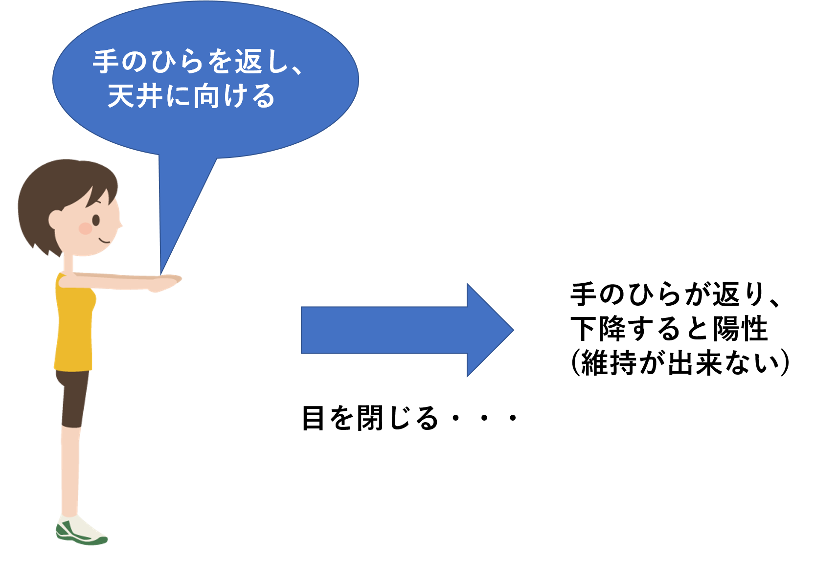 上肢の試験法;両腕を前ならえのようにしてもらい、手のひらを天井の方に向けてもらいます。両目を閉じて、そのままの状態を維持するように伝えて、観察をします。手のひらが返り下降してくると陽性となります。