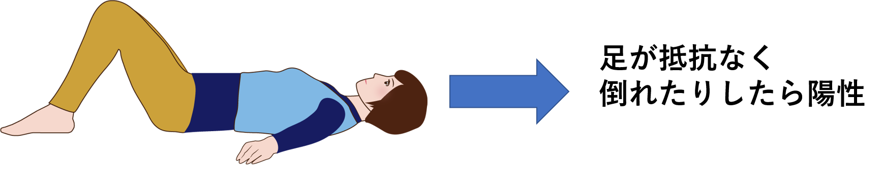 試験法;あお向けで寝てもらい、足をあげてもらい、膝から下を90°まげてもらい維持してもらいます。丁度こういう感じです→(足) ̄|_O(頭)維持できなければ陽性です。