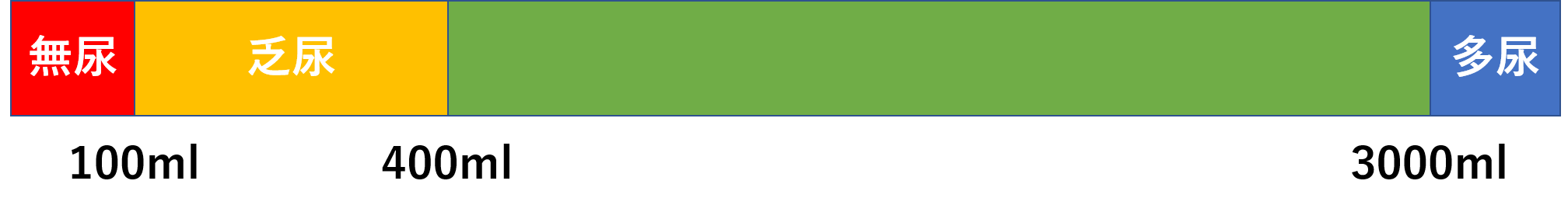 1日の尿量が400ml以下だと、老廃物などが排泄できない状態となるので危険な状態となります。