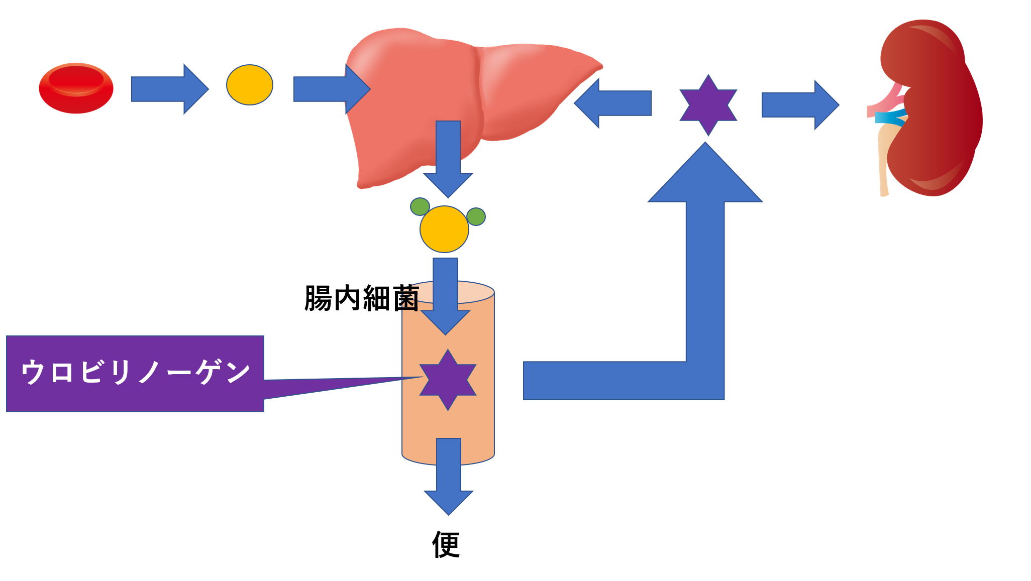 先ほどの過程でビリルビンが作られ、胆汁排泄されると、腸内細菌によってウロビリノーゲンとなります。ウロビリノーゲンはそのまま便と一緒に排泄されます。しかし、一部のウロビリノーゲンは腸管から再吸収され、肝臓でビリルビンになったり、腎臓へ行き尿中にウロビリノーゲンで出てくることもあります。