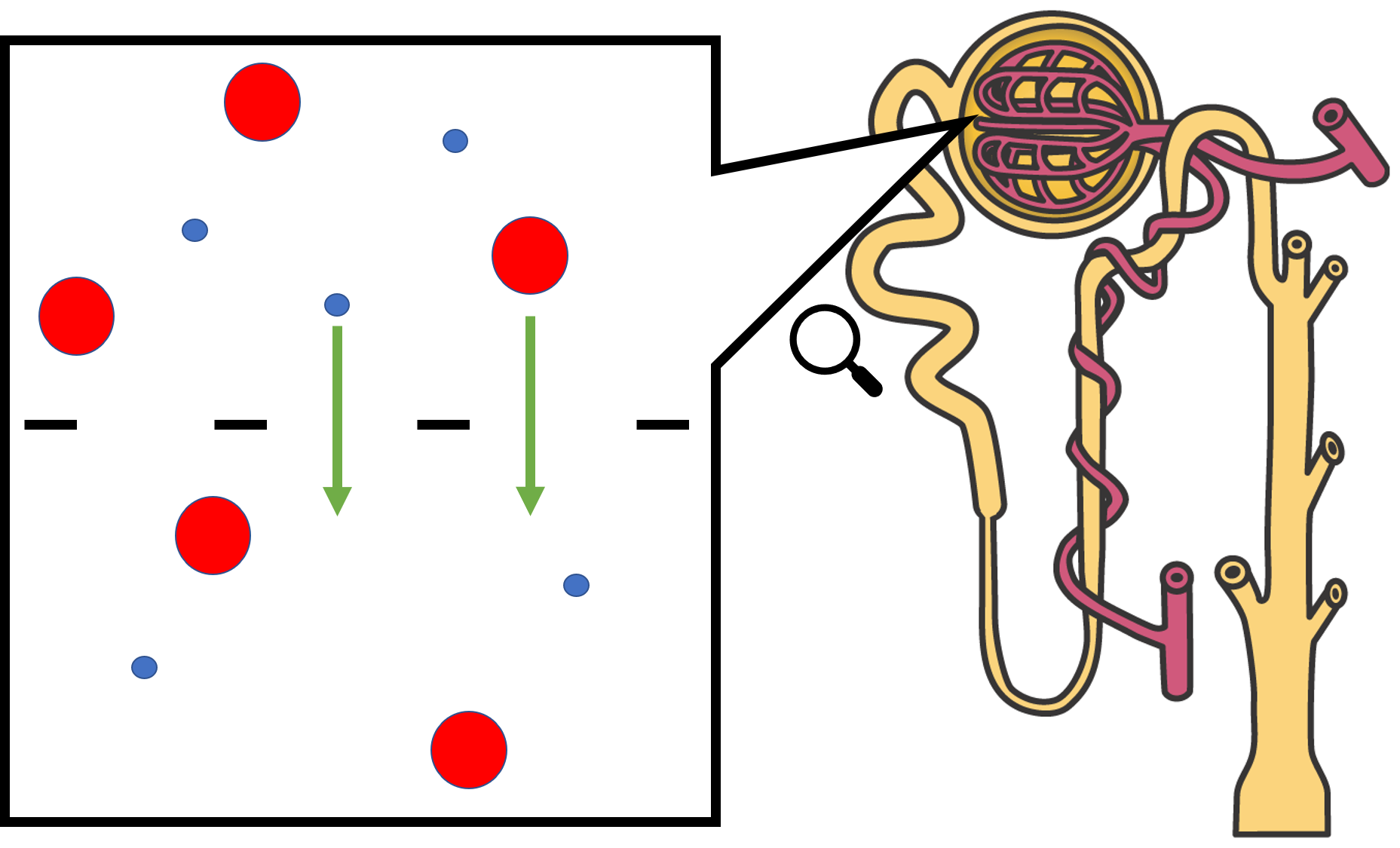 通常の健康な人であれば、高分子蛋白は、腎臓のフィルターである糸球体を通過できず、尿中には出てきません。それに対して、低分子蛋白はフィルターの網目をすり抜けることはできます。
